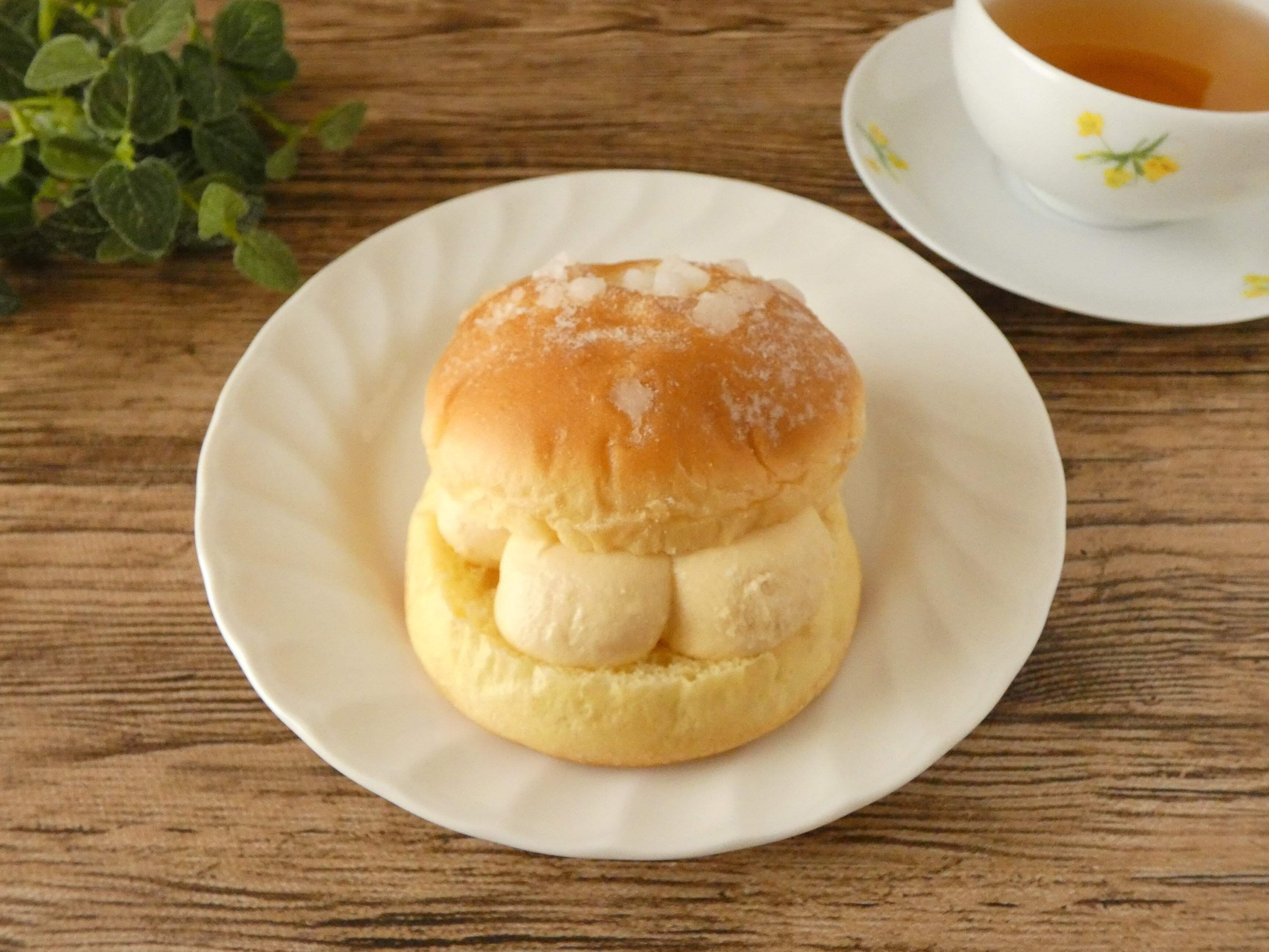 オレンジピール入りのブリオッシュ生地にクリームがたっぷりサンドしてあり、上にはパールシュガーがちりばめられています。