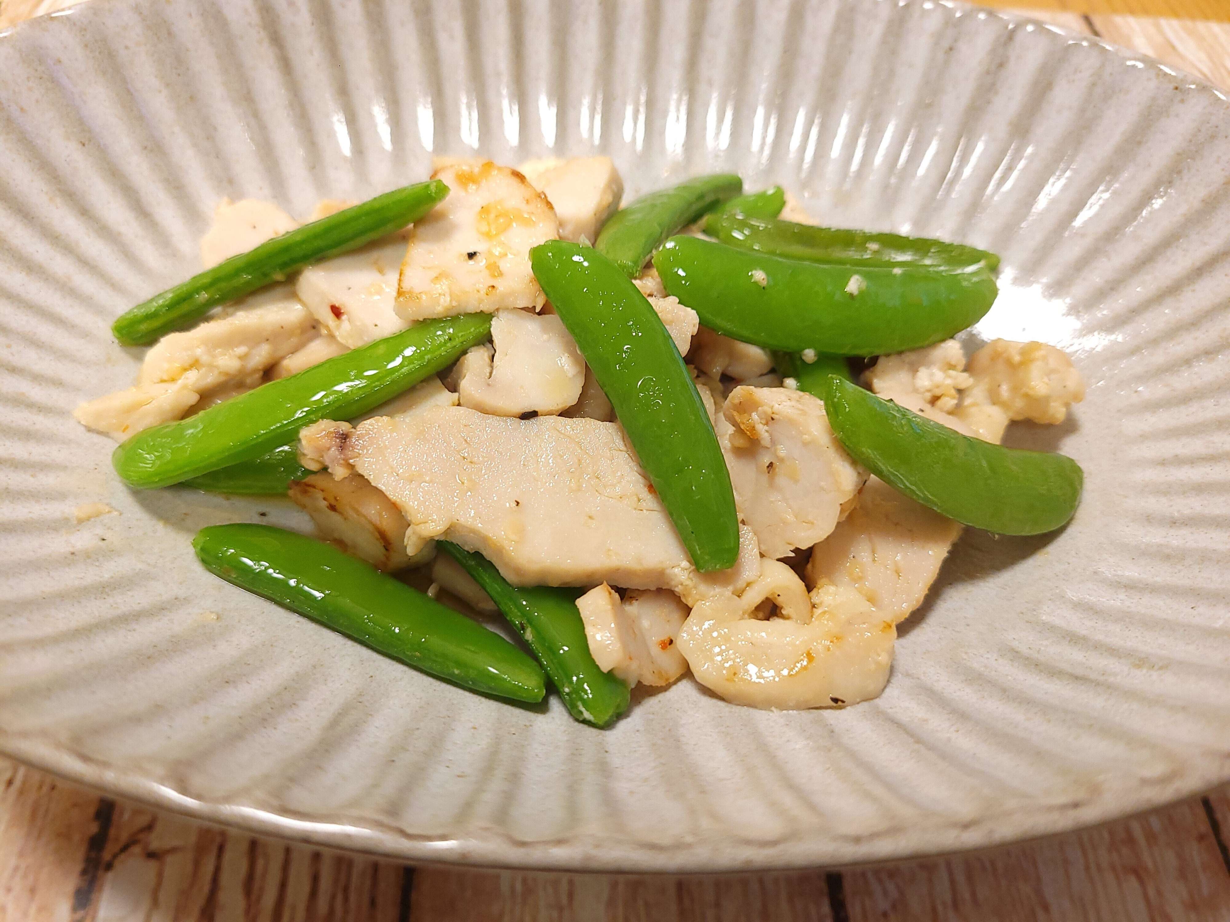 こちらは、スライスした鶏ハムとスナップエンドウをハワイアンチョップドガーリックオイルで炒めたもので、これも調理時間10分もかからずにできてしまいます。肉や魚料理、野菜料理とも相性のよい万能オイルで、これ1本で料理の幅がグッと広がるおすすめ商品です。