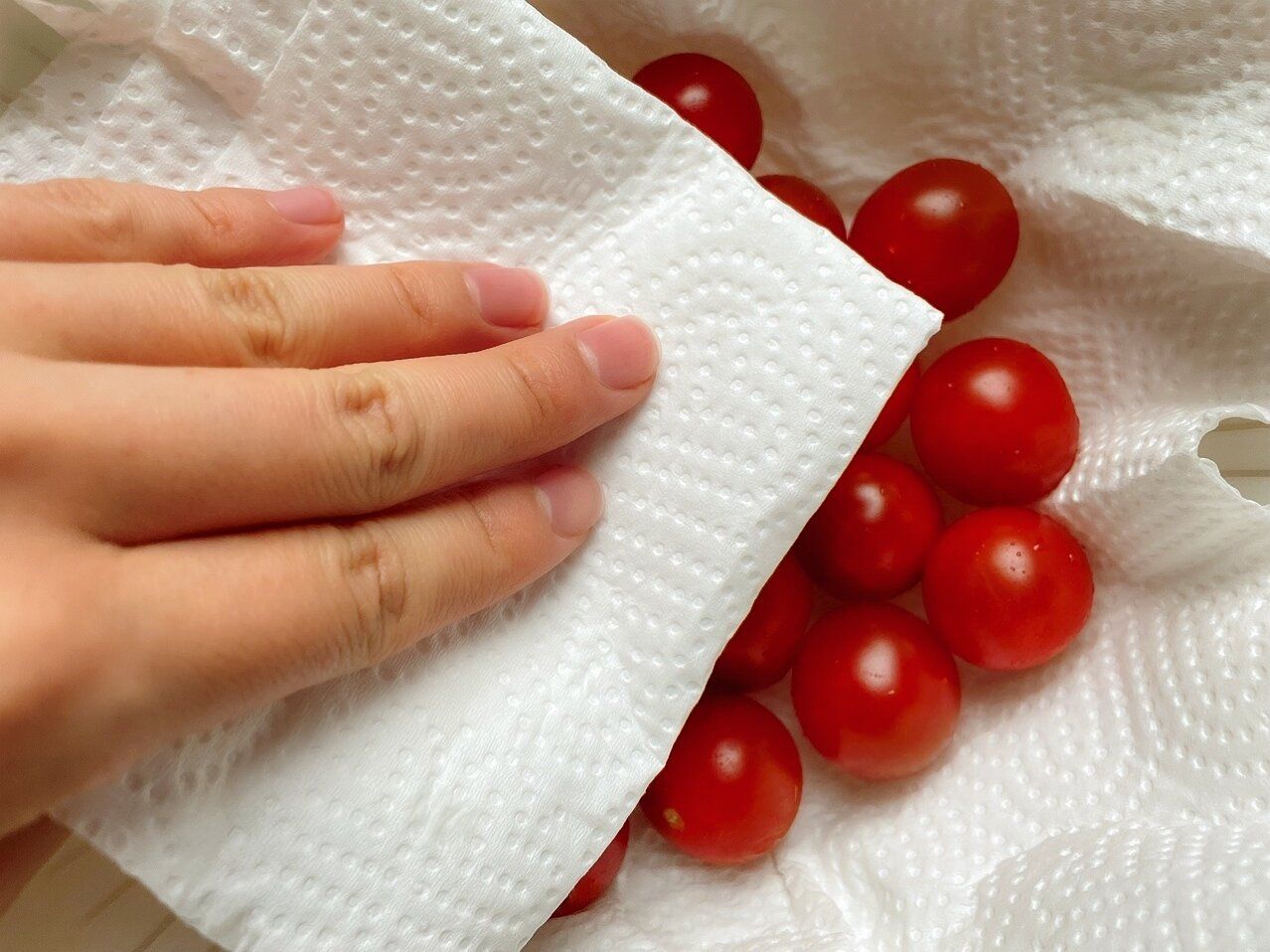 水分がのこってしまっていると、腐敗が進む原因となるためしっかりふきとるようにします。保存容器にもキッチンペーパーを敷いておくと、水分を吸収してくれるだけでなくクッションがわりにもなりますよ。