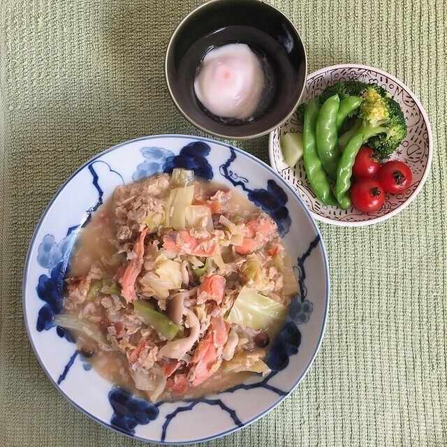 オートミールを活用した朝食は、この日も続けています。オートミールといっしょに、紅鮭とキャベツをみそで炒めたレシピ。トウバンジャンのピリッとした辛さが効いていて、ヤミツキになりそうですね。温玉や野菜を添えて、彩り鮮やかな食卓にしています。