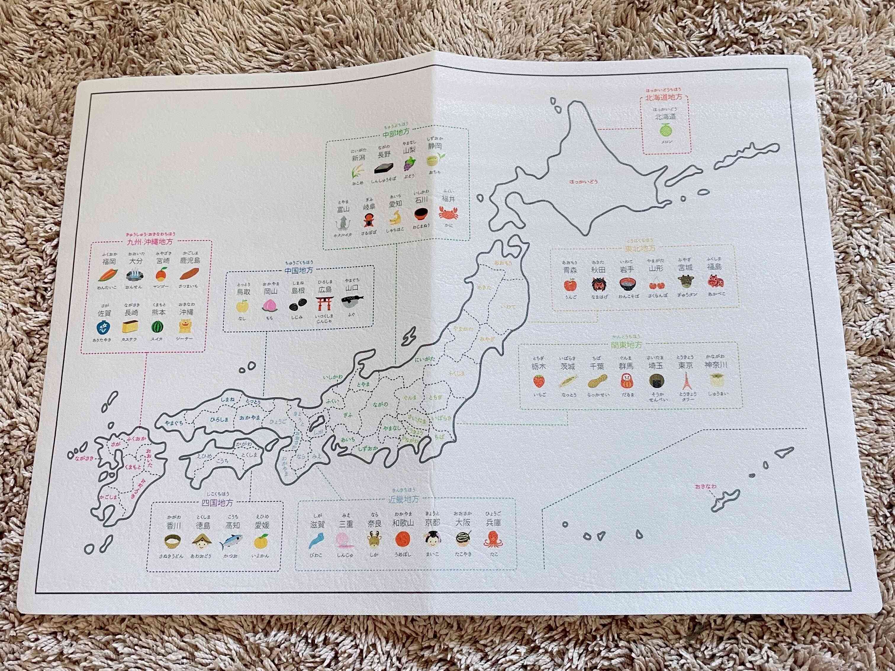 この地図の見どころは、都道府県だけでなく名産品も学べるところです。
