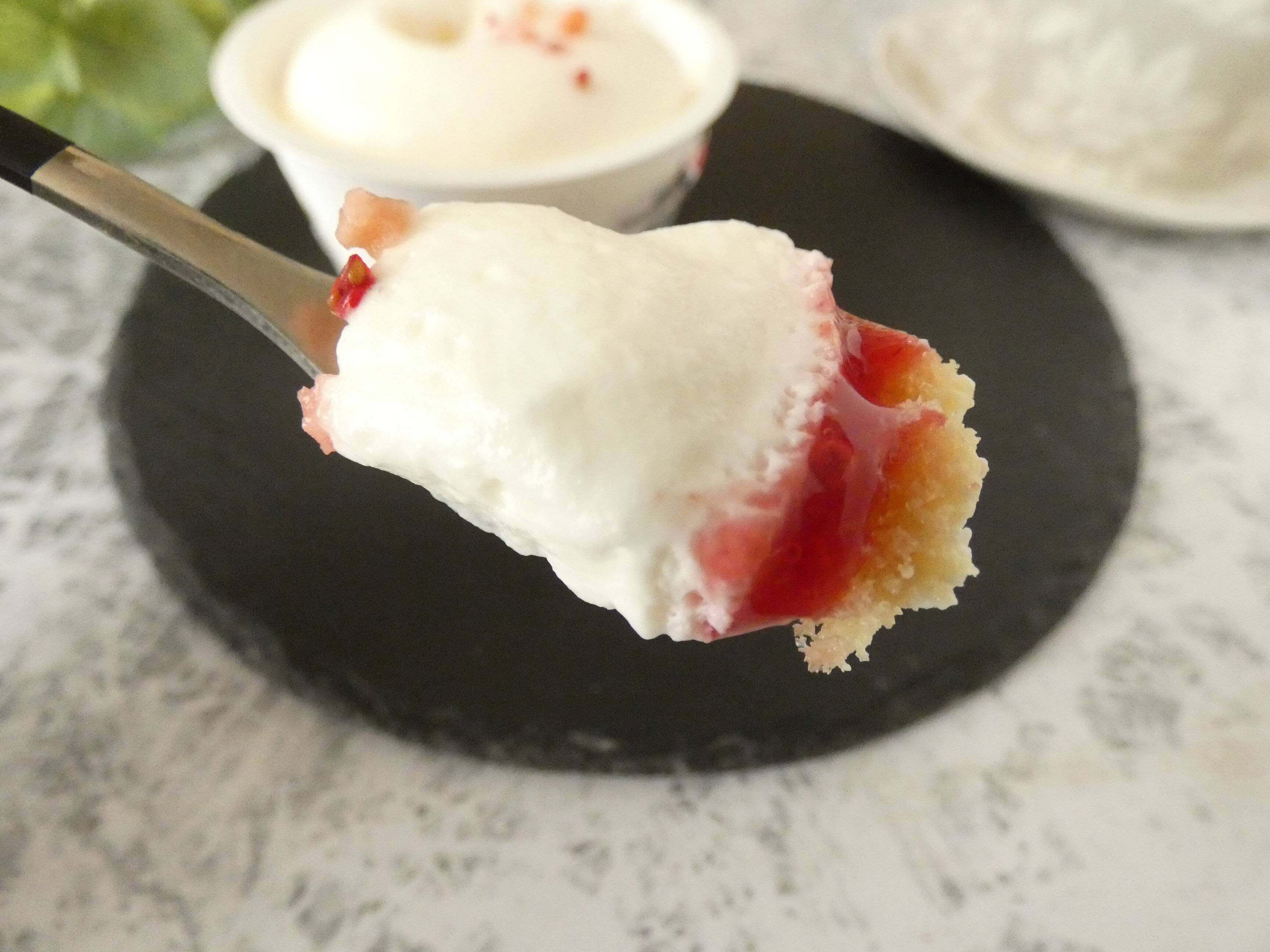スプーンですくってみると、チーズクリームはメレンゲを混ぜ合わせてあるのでふんわり。たっぷり入っているので、スポンジケーキとラズベリーソースがなかなか見えてこないほどです。一口食べると口の中でシュワッと消えてなくなるほど軽い口溶け。