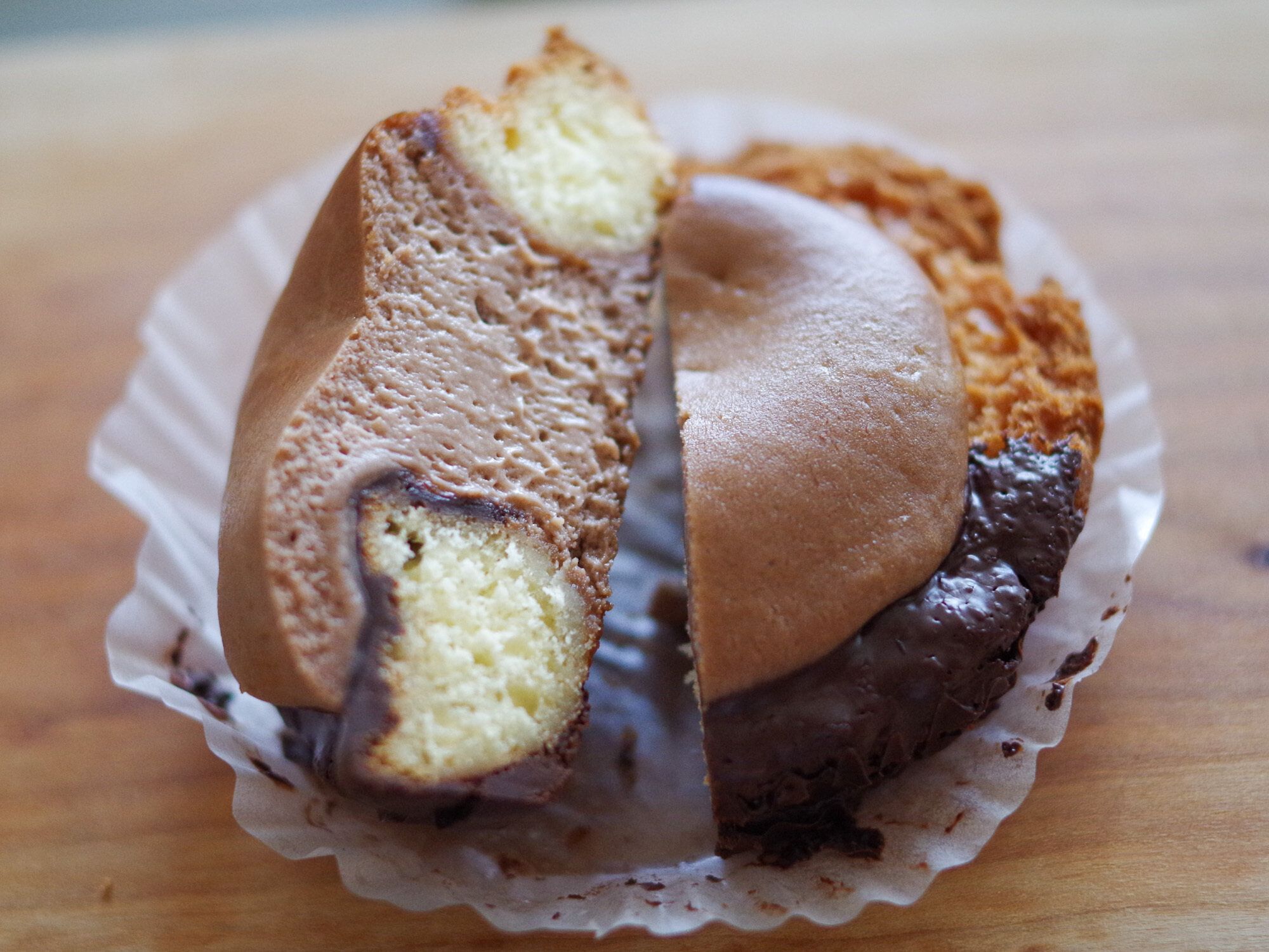 ベイク チーズタルトドーナツ同様、たっぷり入っていて滑らか!チーズっぽさが強くて、チョコレートの甘さは控えめ。夏でもサッパリ食べやすい味わいでした。チョコファッションのチョコレートがかかった部分は、特にチョコレートの濃厚な味わいが楽しめます。こちらも冷やすことができます。