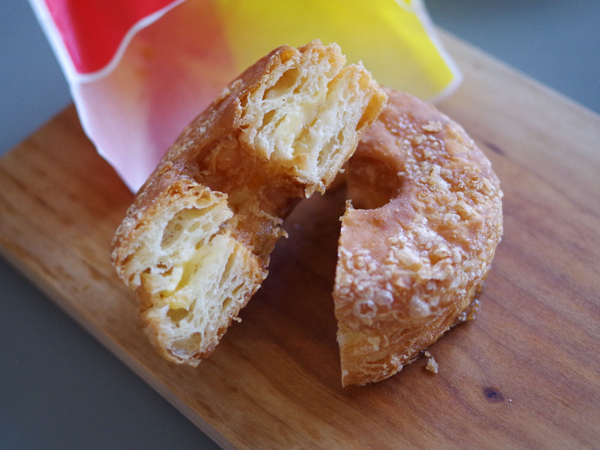 サクサク、というよりザクザクとしたしっかりとした歯ごたえが楽しめるドーナツでした。パイ生地にサンドされたリンゴフィリングは、シャキシャキとした食感と、爽やかな甘みが際立って美味!カスタードクリームの甘味が加わって酸味がやわらぎ、食べやすいです。なお、半分を冷やしてから食べてみても、シナシナになることもなく、サクサク状態がキープされていたんです♡