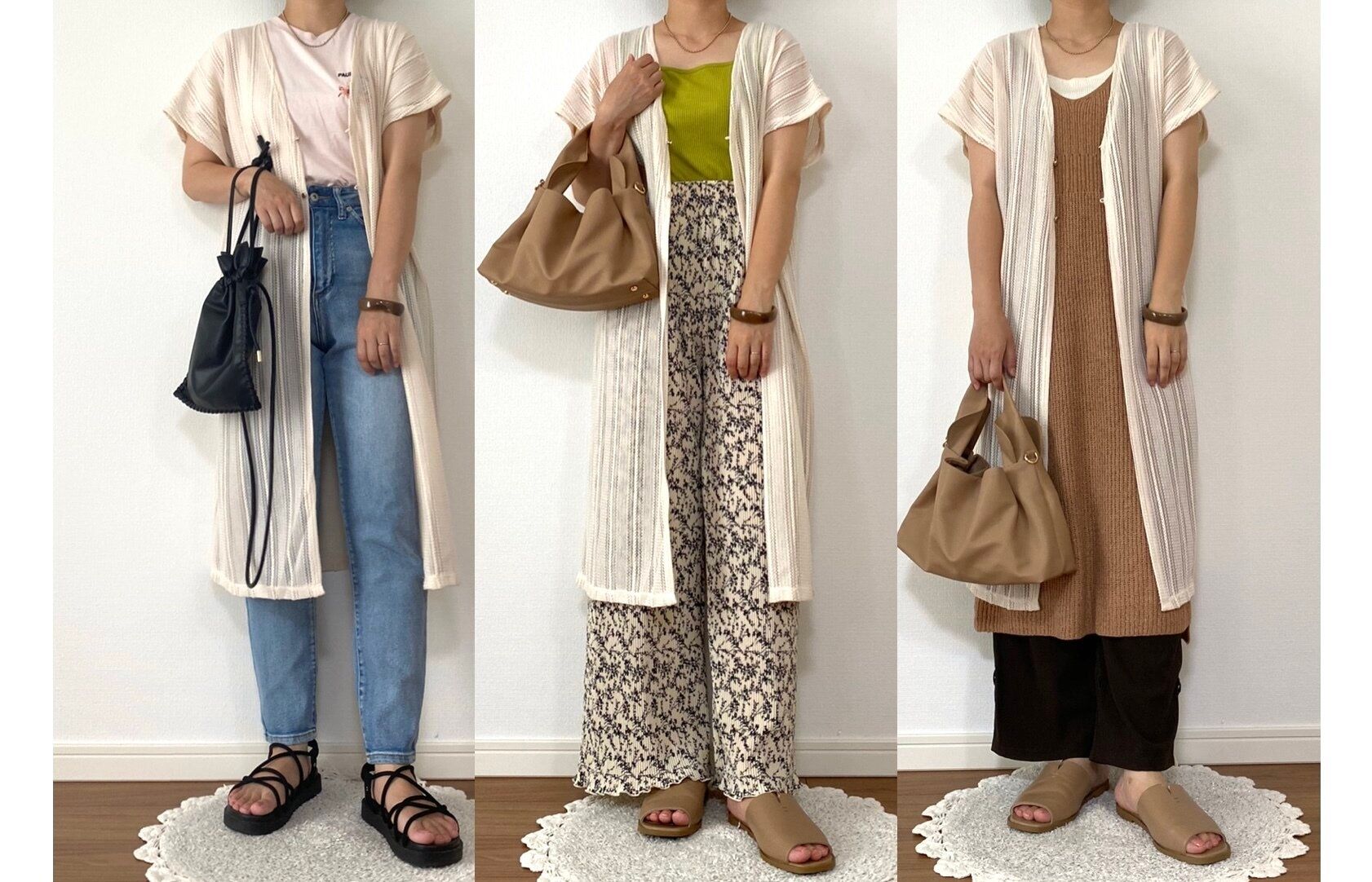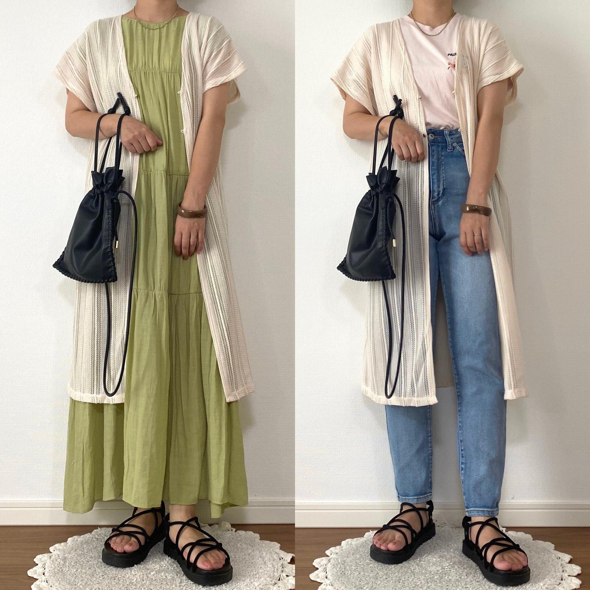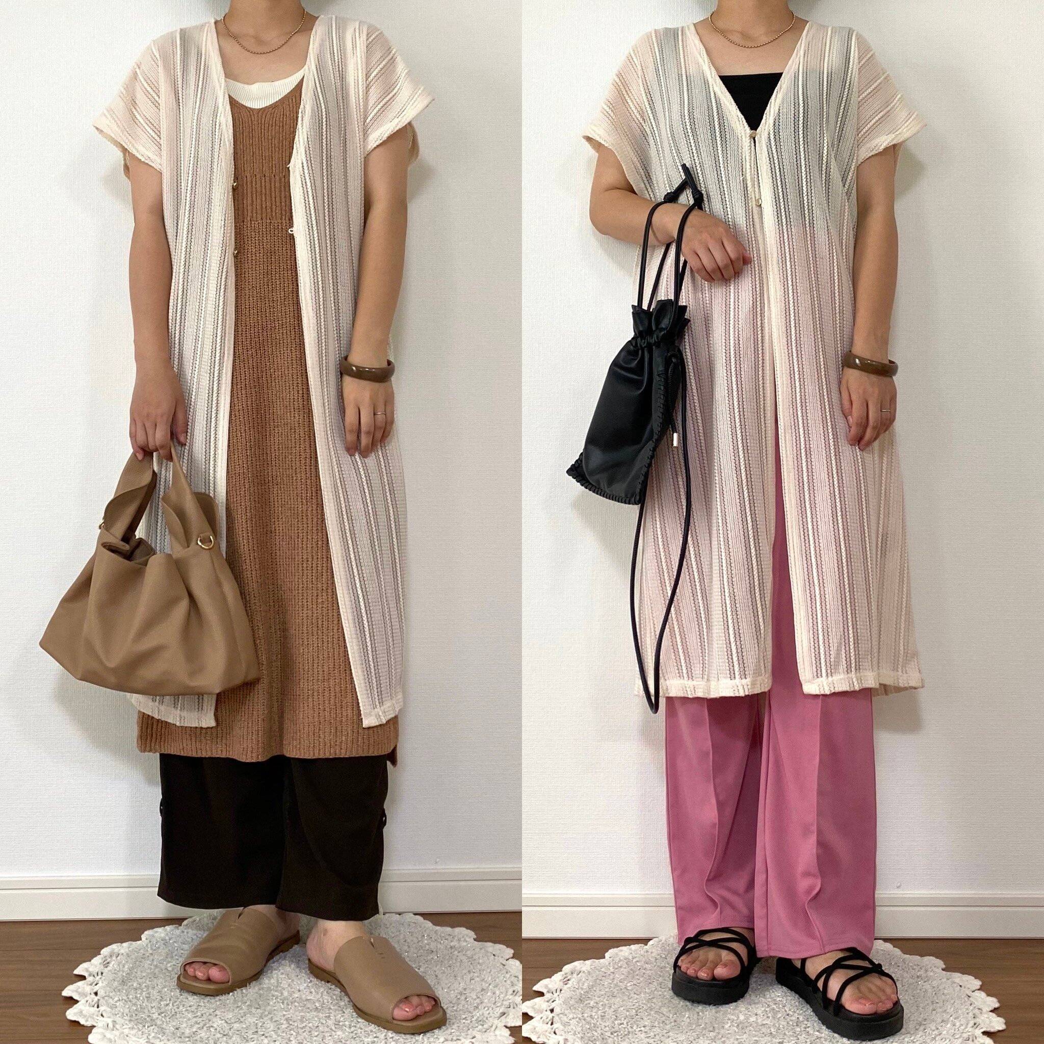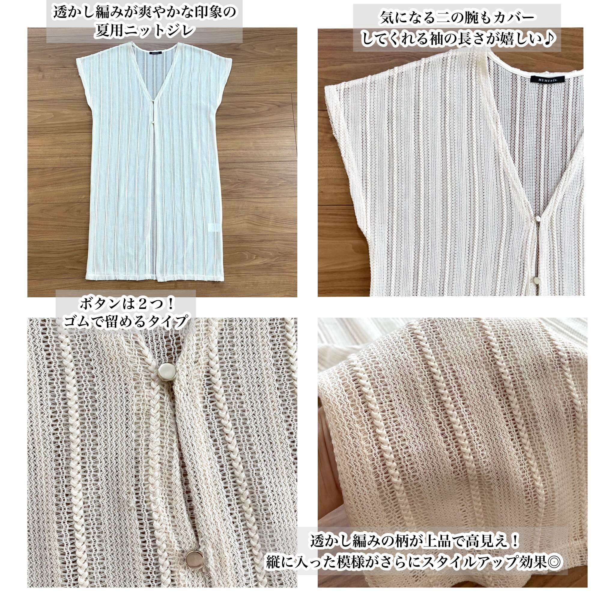 前を閉じてきてもインナーが見える透かし編みは涼しげで夏コーデにぴったり!