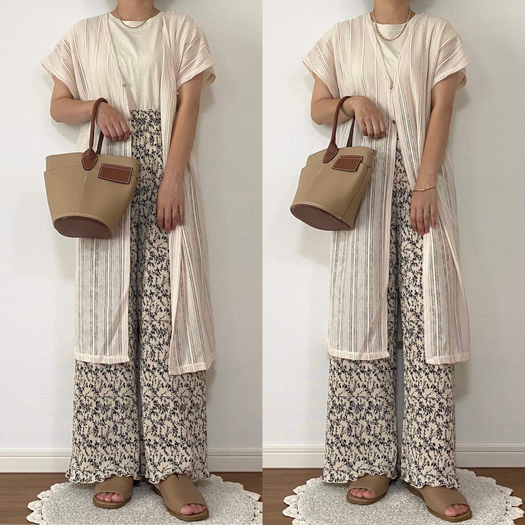 いくら暑くてもタンクトップ1枚では…と抵抗がある方も、透かし編みのジレを羽織ればおしゃれに涼しく露出を減らして大人でも安心感のあるコーデに。