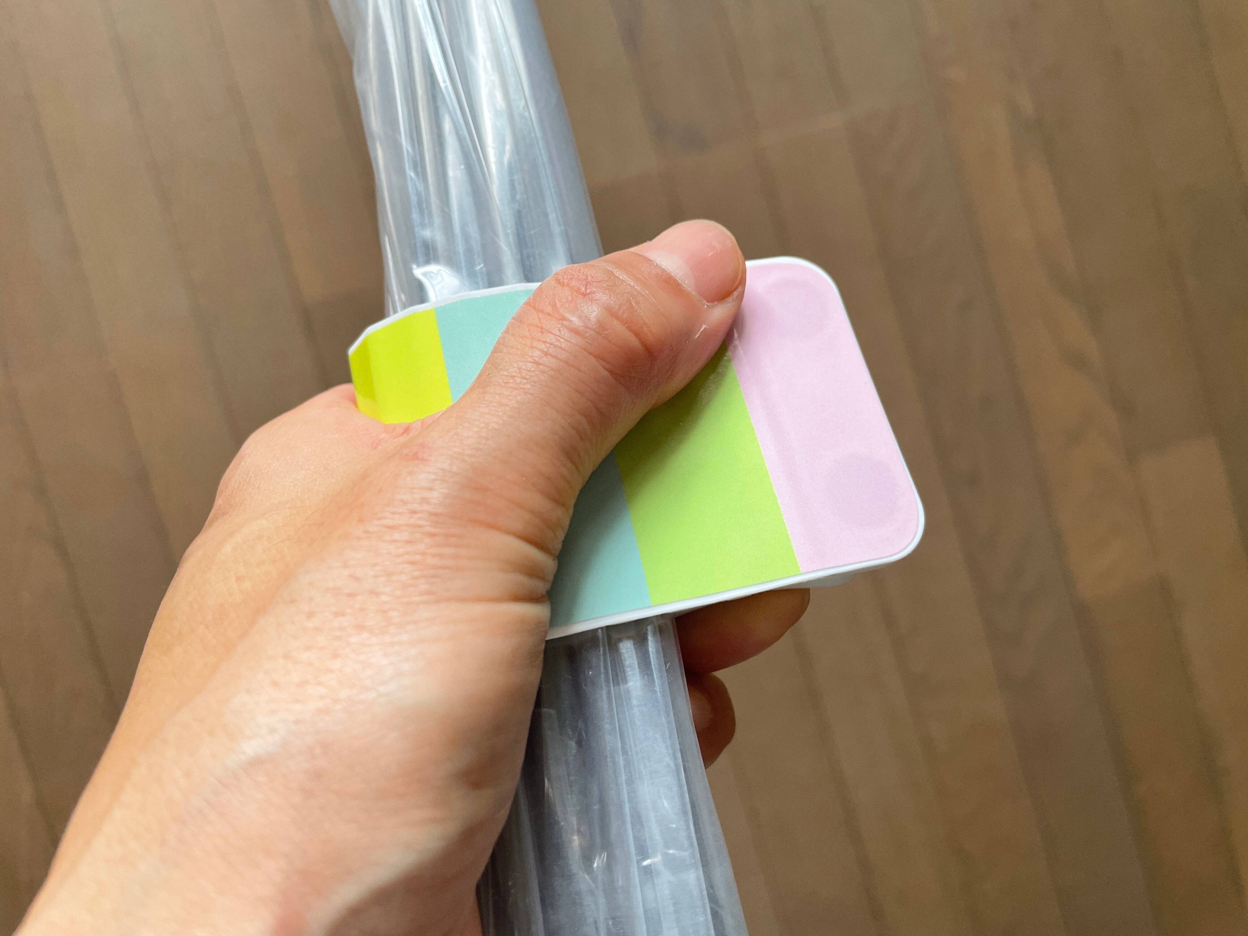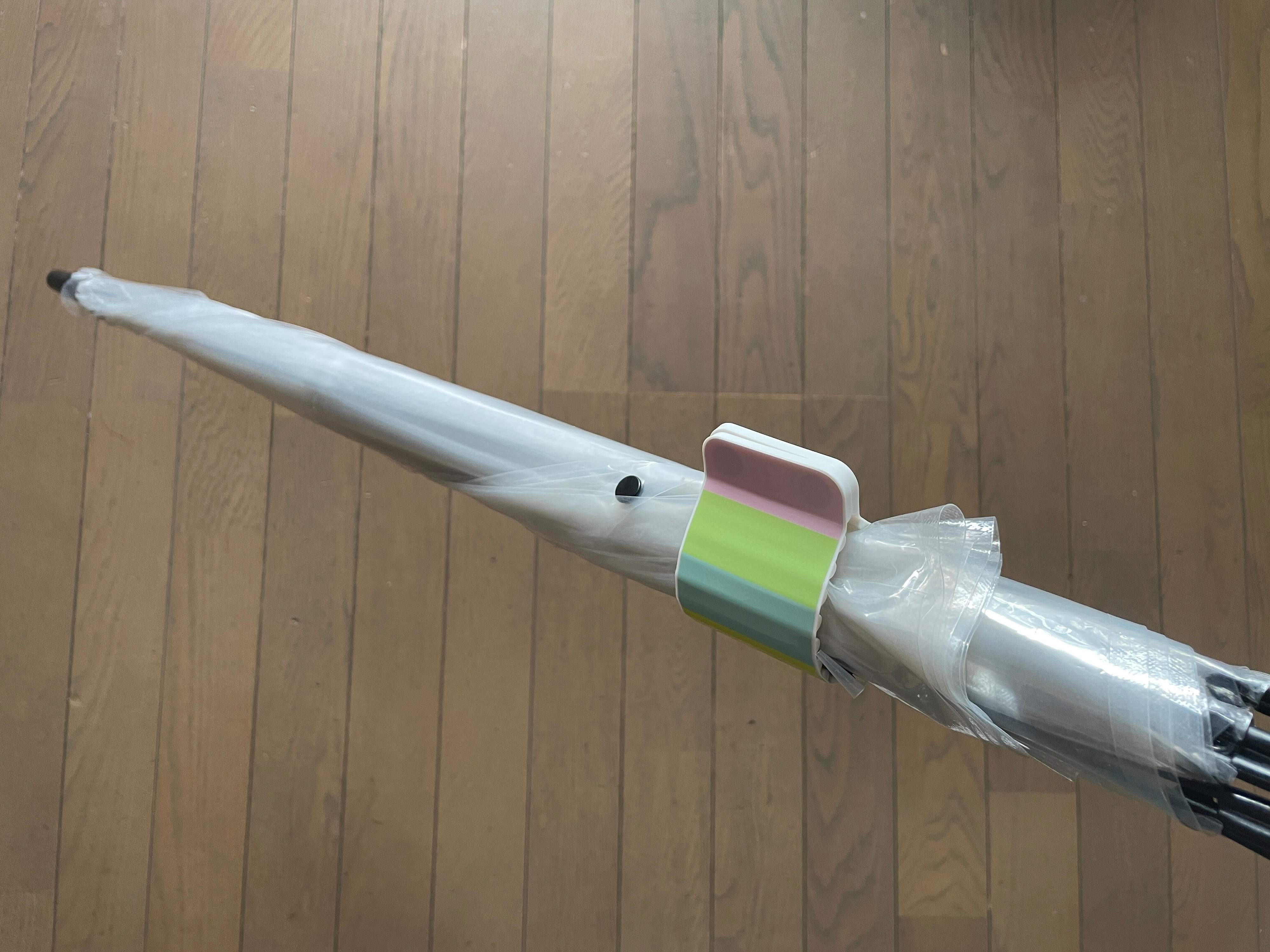まずは、閉じた傘の先端近くにパチっとつけます。マグネットで開閉できるので、簡単につけられますよ。