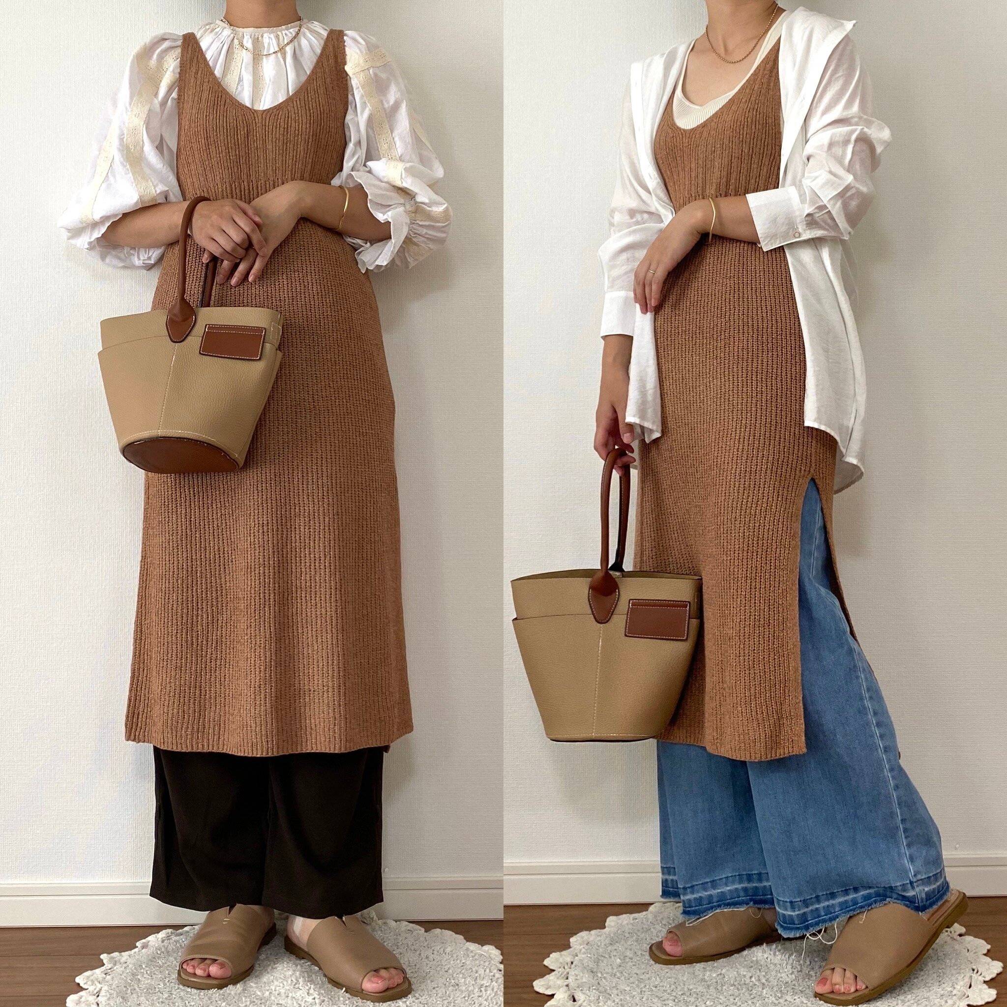 左はベージュとブラウンで淡色コーデにまとめました。