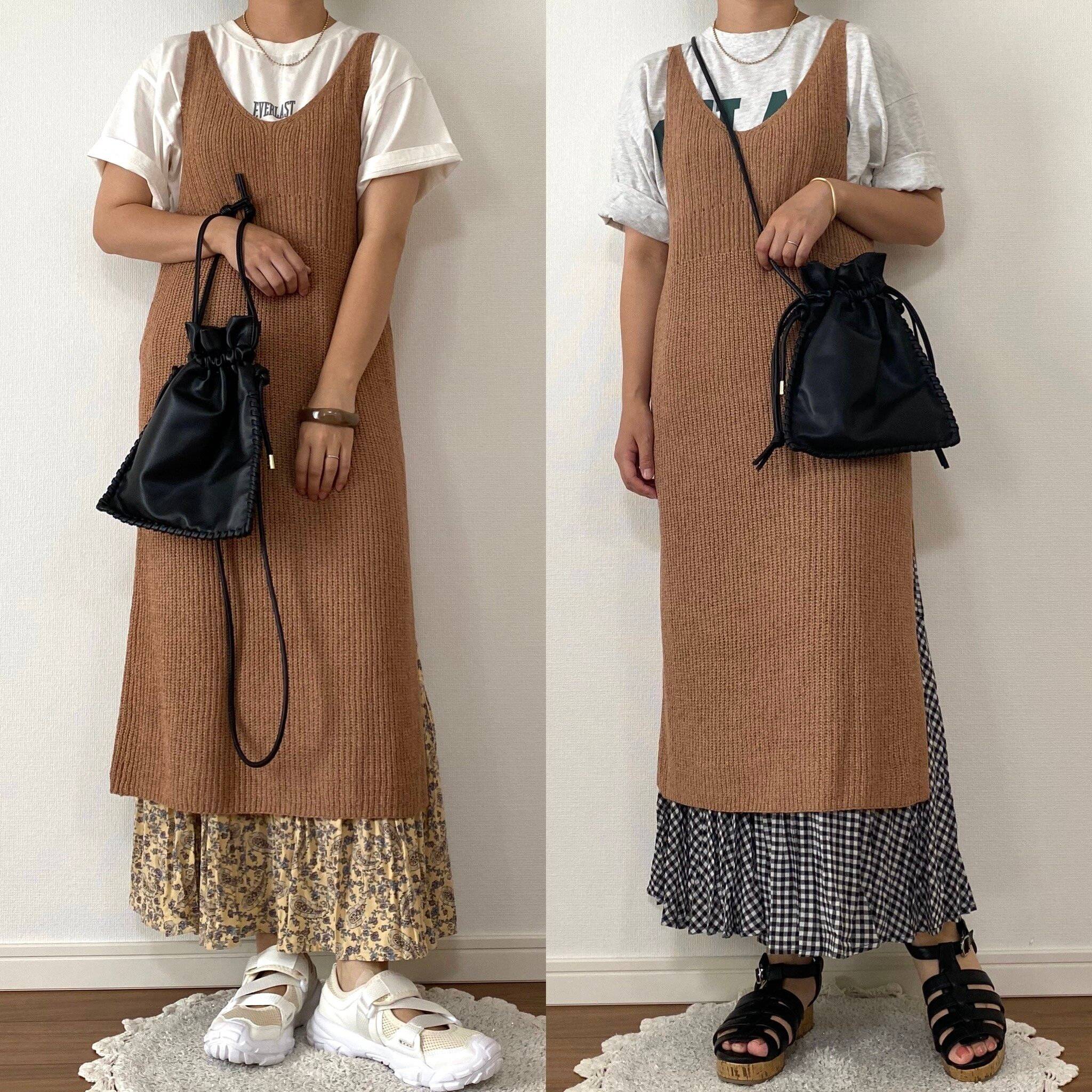 2wayなので右のコーデは前後を入れ替えて着てみました。こちら側が前だとタンクトップとレイヤードする時も胸元が気にならなくていいですね。