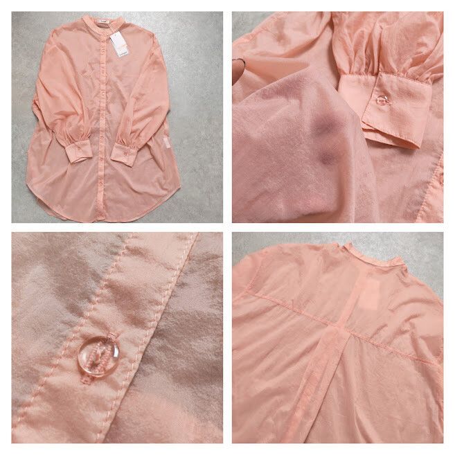 鮮やかなサーモンピンク。よく見るとボタンがクリアボタンで透け感と透明感で爽やかさMAX。サテンのようなつるっとした質感もありハイブランドのようなクオリティです!