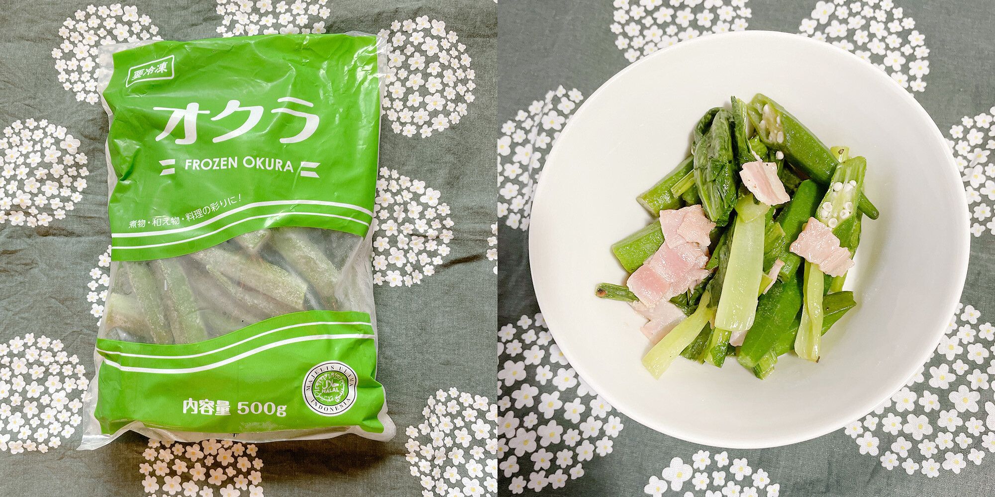 今回初めて買ってみたのは、カットしていないオクラ。大きさも十分なオクラが500gも入っています。解凍したものを半分にカットし、ベーコンと小松菜と一緒にバター醤油で炒めました。
