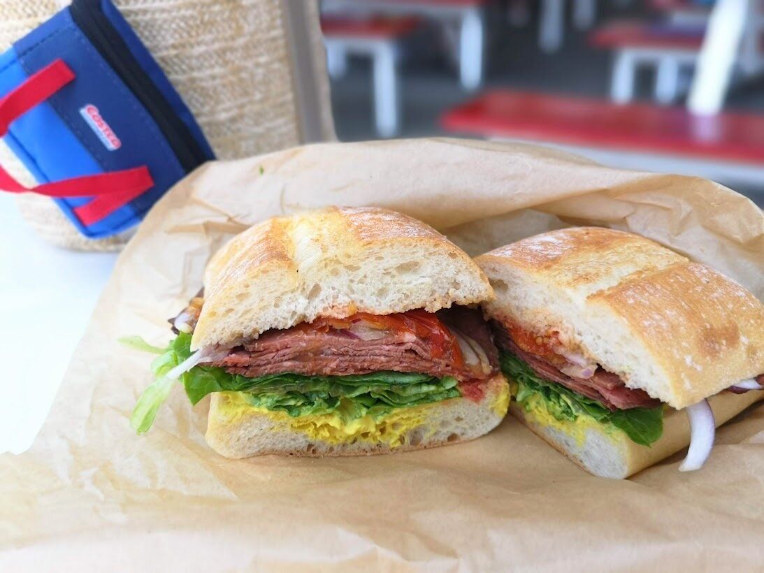 ハード系のパンにたっぷりの具材が挟まれていて、上からドライトマト、ソース、玉ねぎ、ローストビーフ(10枚)、レタス、マスタードと王道の組み合わせ!