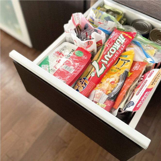 こちらもストック食品ですが、細かいモノがメインなので仕切っています。