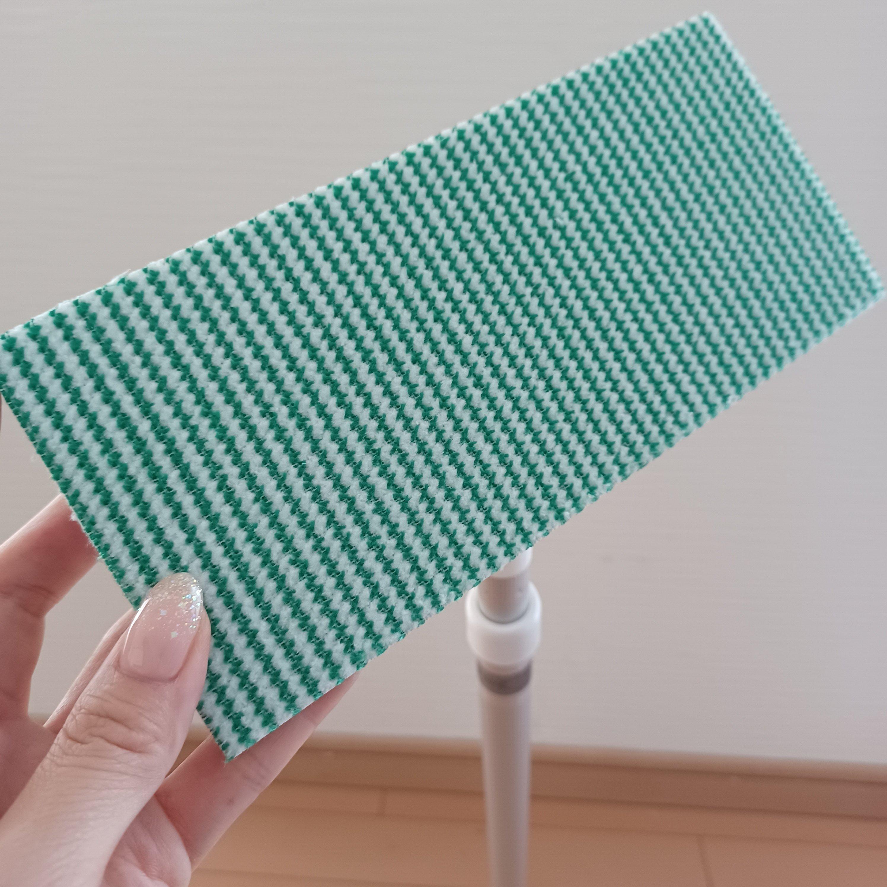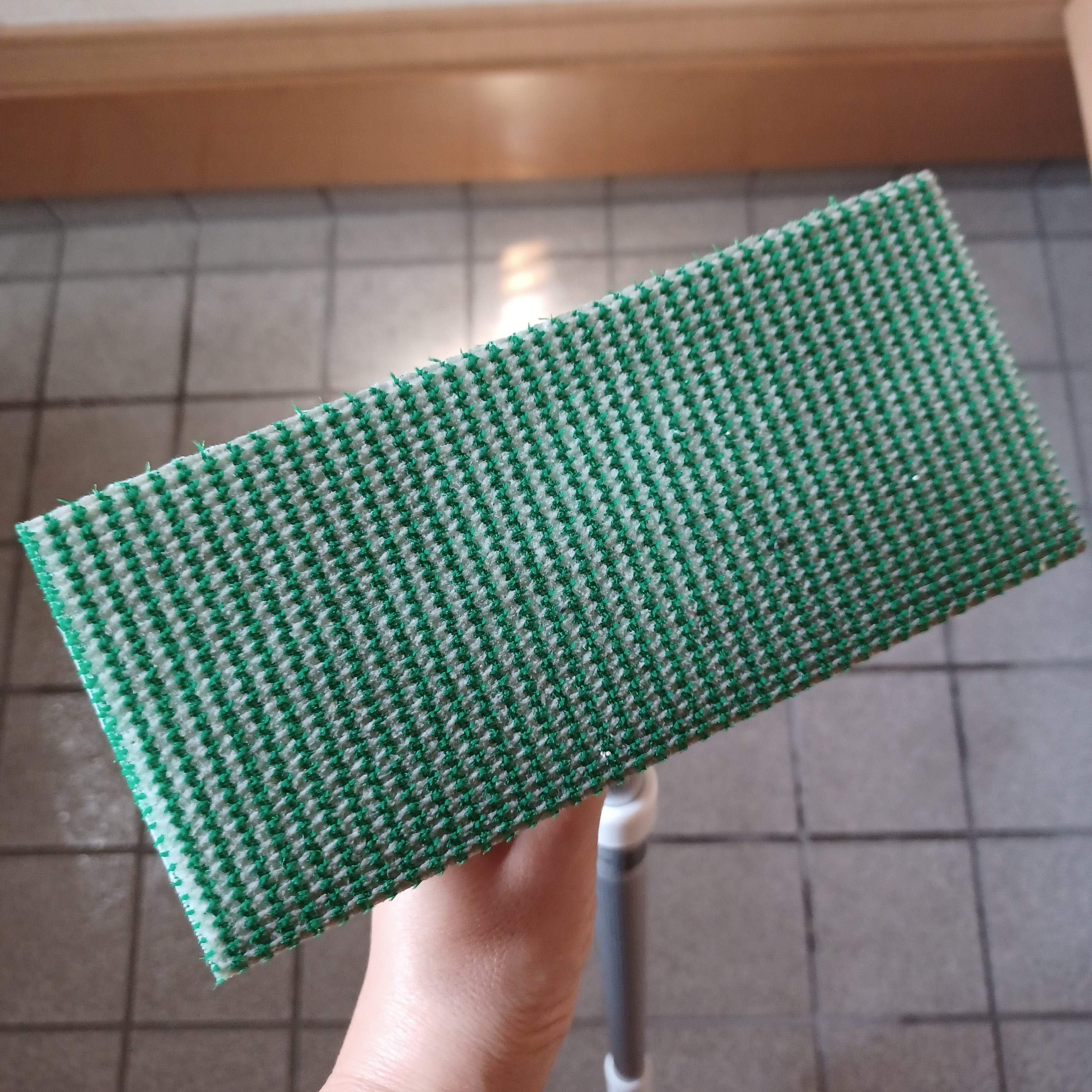 緑の繊維が凸凹に入り込んで汚れをかき出してくれて、白の繊維が浮いた汚れを拭き取ってくれるというもので、洗剤要らずなんです。