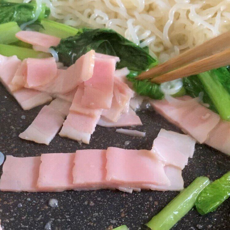 フライパンにオリーブオイル・にんにく・(鷹の爪)を入れ、香りがたったらしらたき・小松菜・ベーコンを炒める。