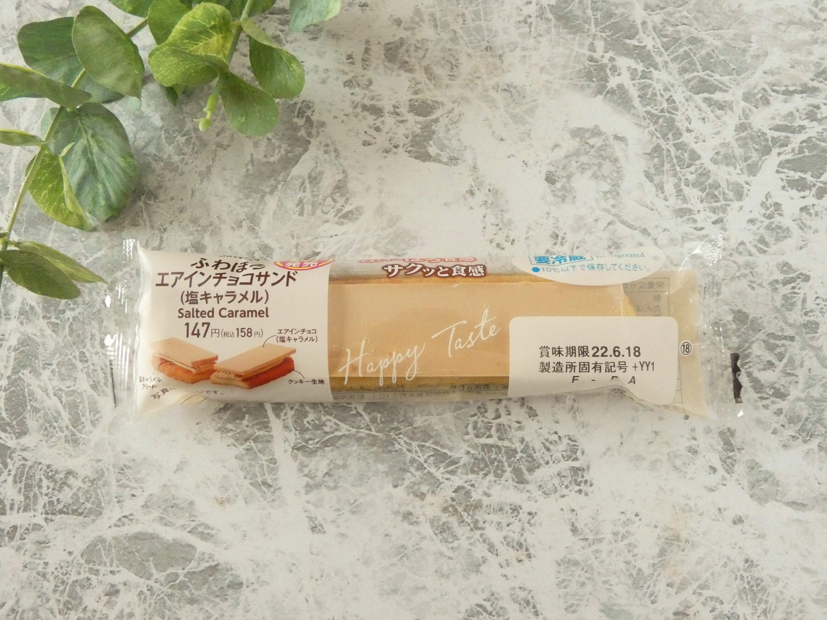 ファミリーマート新発売の「ふわほろエアインチョコサンド(塩キャラメル)」は158円。