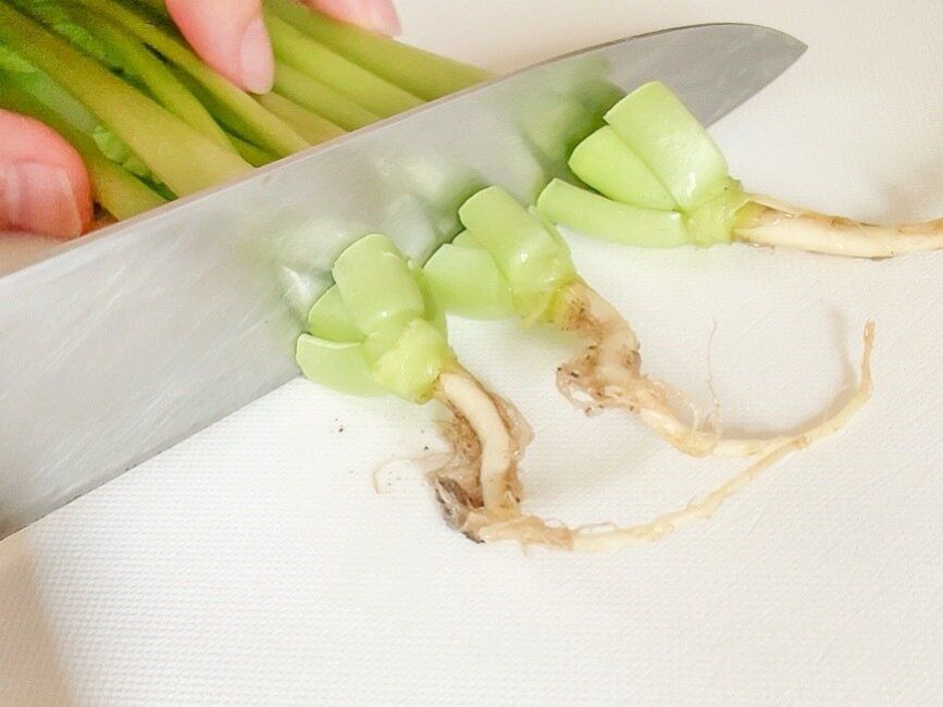 根を先に切り落とし、茎を束ねて持ったまま、水を張ったボウルに入れてふり洗いします。