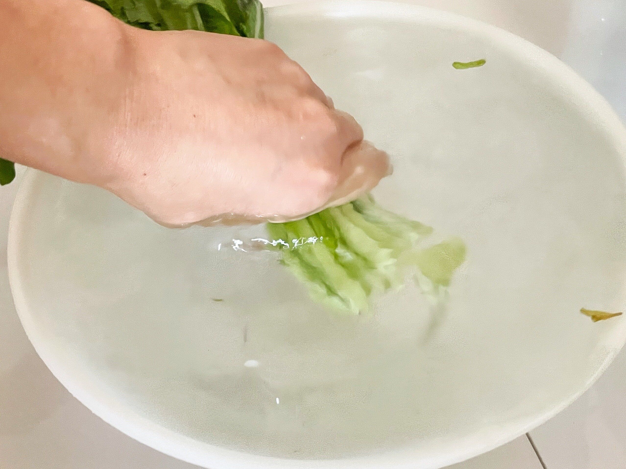 (2) 茎をしっかり持って、水を張ったボウルの中でふり洗いする。