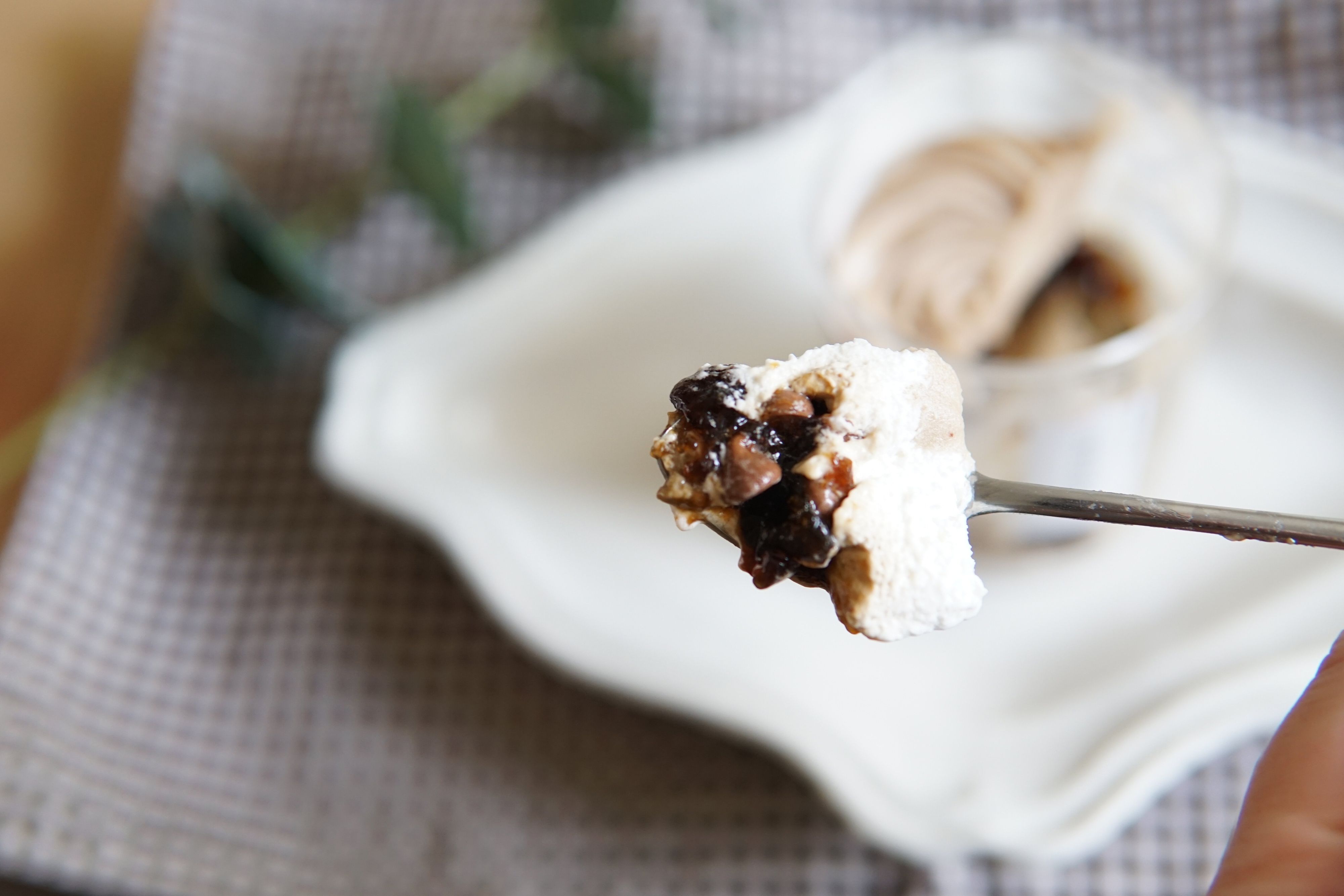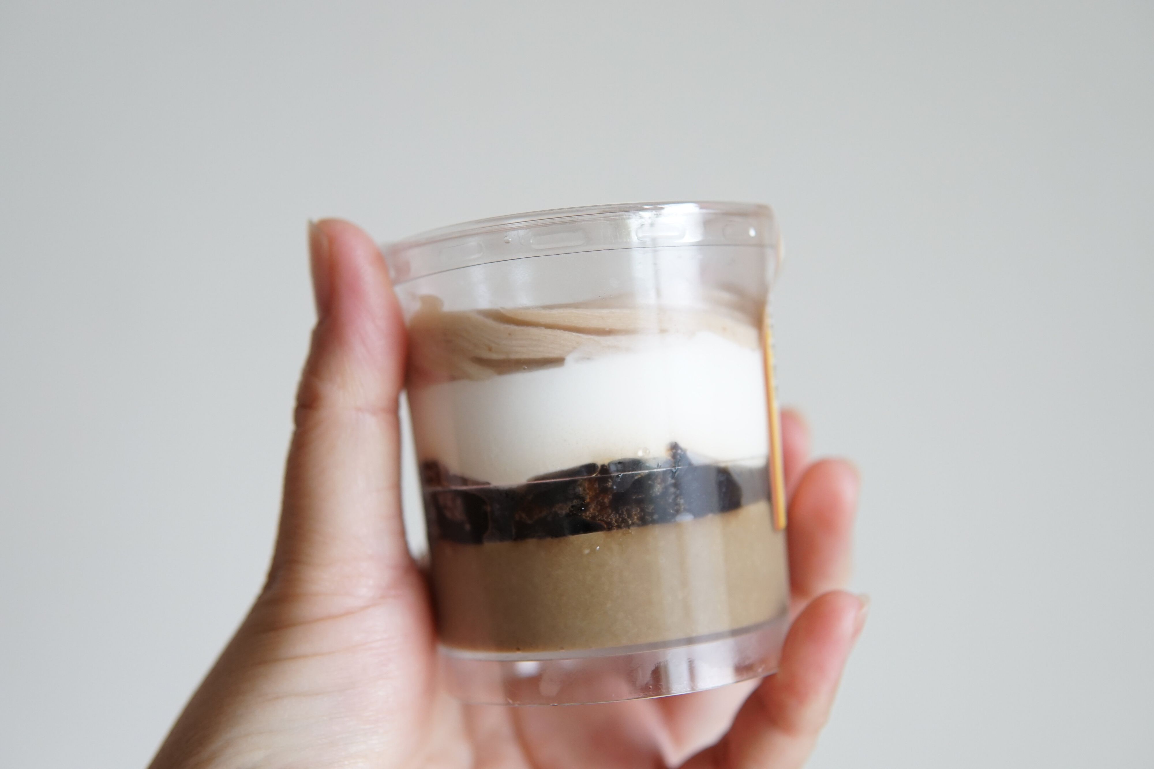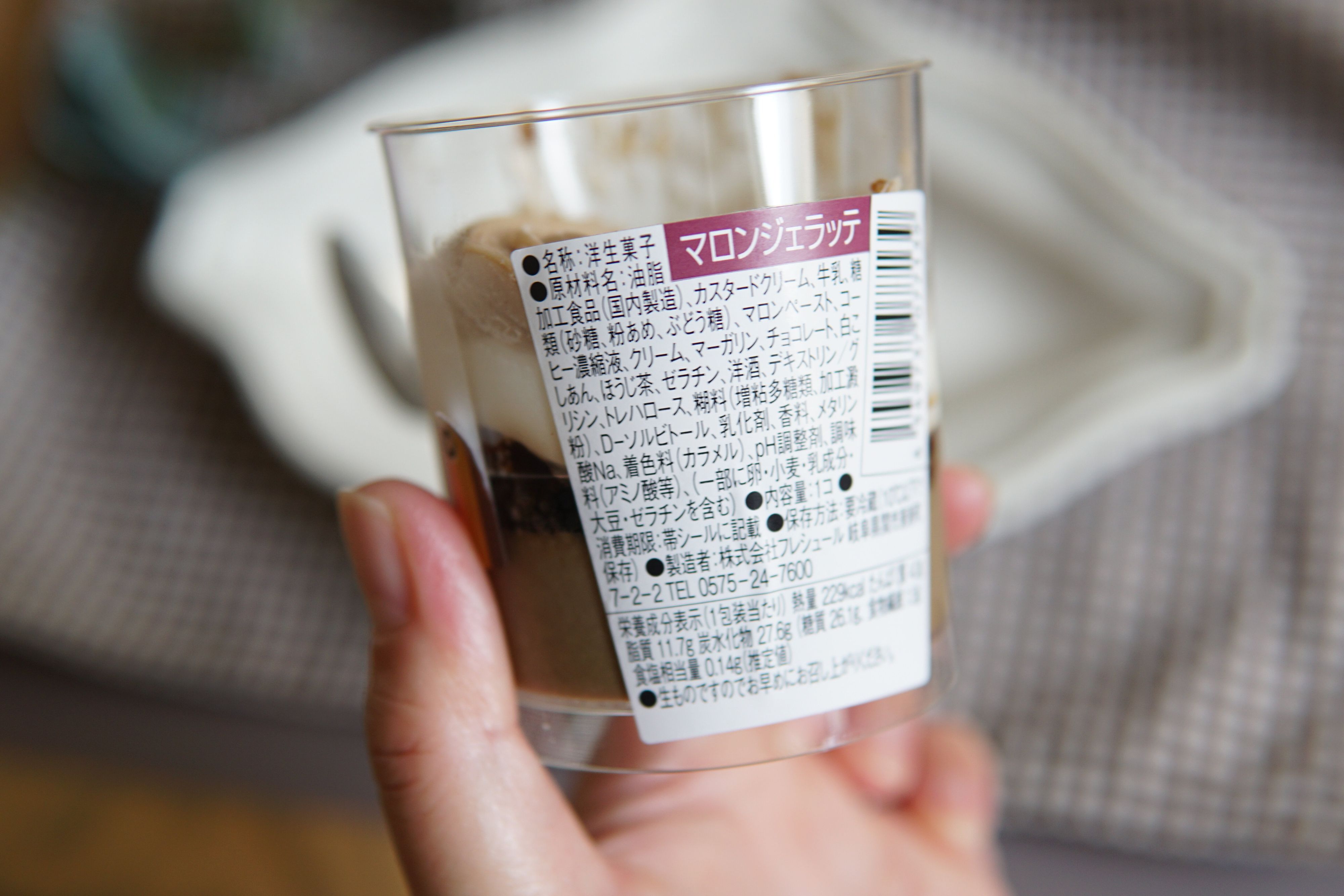 一番上にあるマロンクリームと、一番底にある珈琲ほうじ茶ムースに和スイーツ感があります。特に珈琲とほうじ茶という、ドリンク同士をかけあわせたムース、この発想が面白いですね。珈琲の苦みも感じられるほうじ茶といった味がしました。また、原材料を見ると、白こしあんの文字。あんこが入っていることで、より、和の雰囲気が強まっているのかなと感じます。