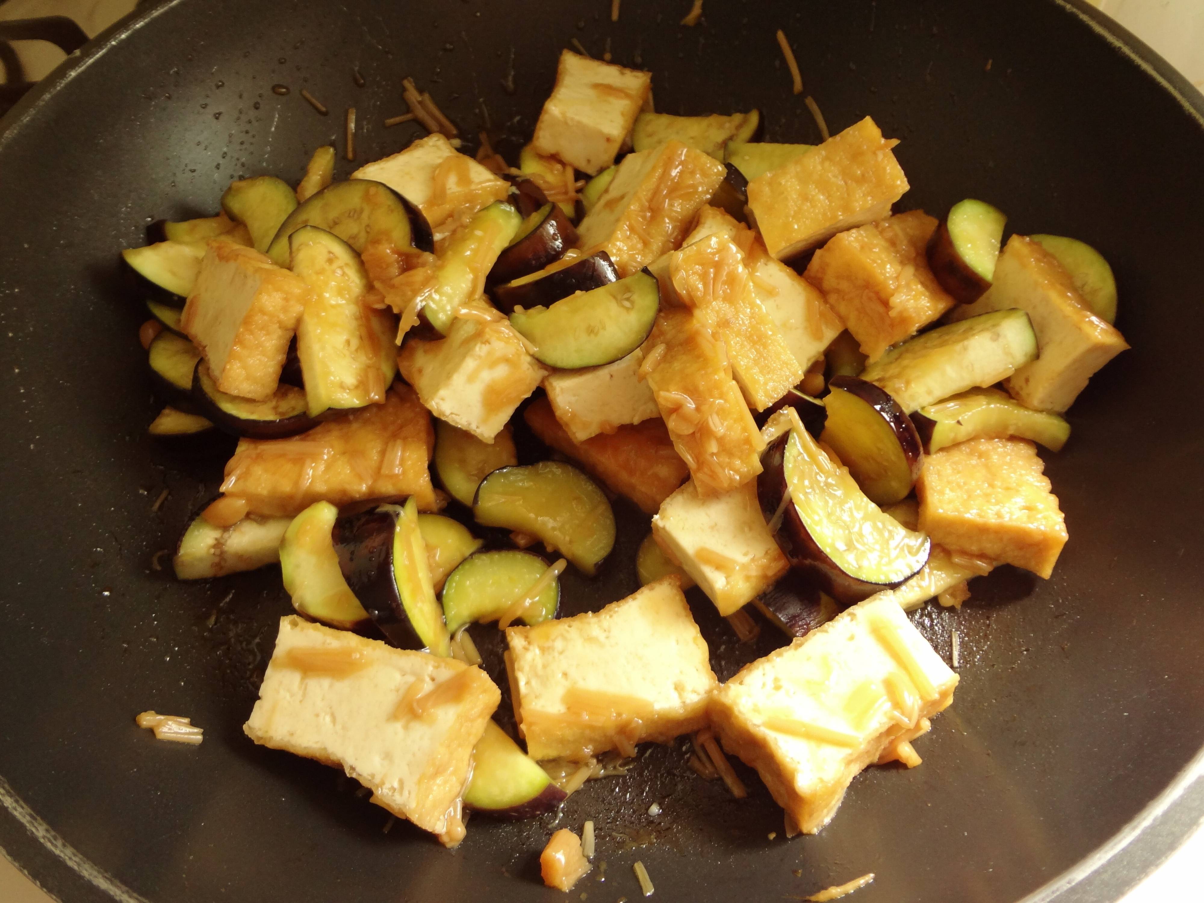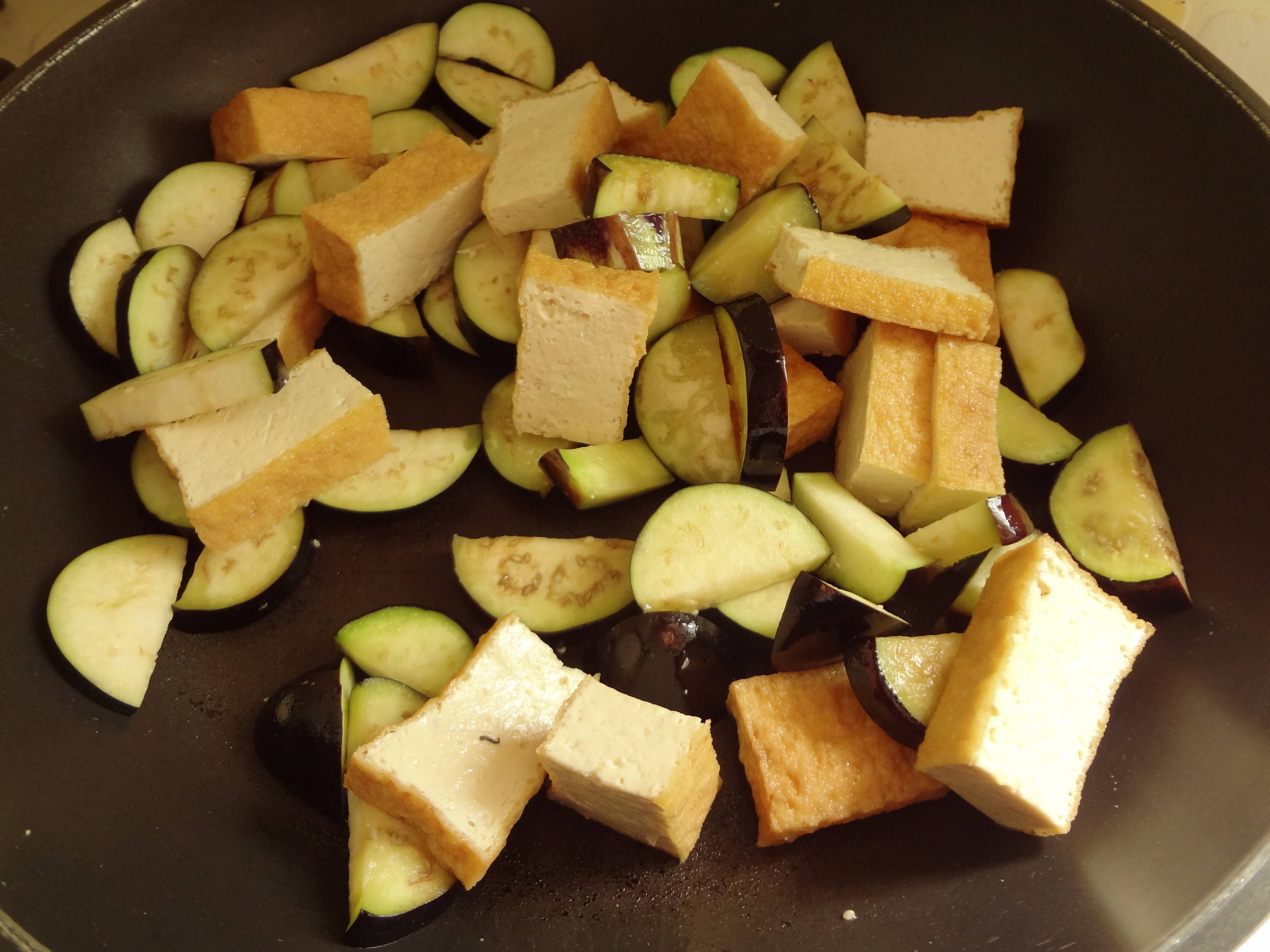 2.フライパンに油とナス、厚揚げを入れて炒めます。