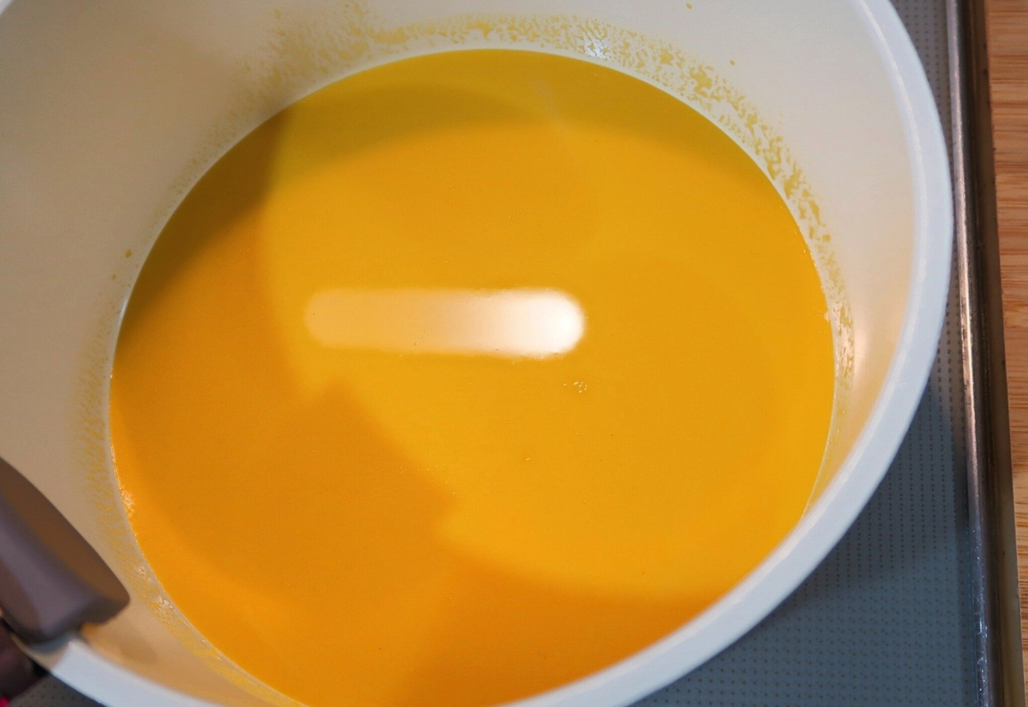なべに残りの「冷たいかぼちゃのスープ」を入れ、ときどき混ぜながら弱火で約3分加熱し火を止めます。