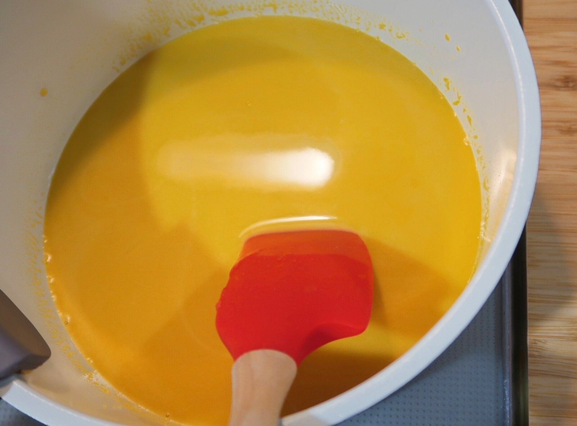 冷蔵庫から取り出し、仕上げ用に残しておいたかぼちゃのスープをかけます。