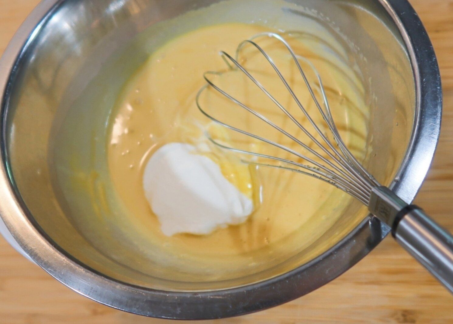 泡立てた生クリームを3回に分けて加え、泡立て器でそのつどよく混ぜ合わせます。全体が均一になったら、味見をして塩で味を調えます。