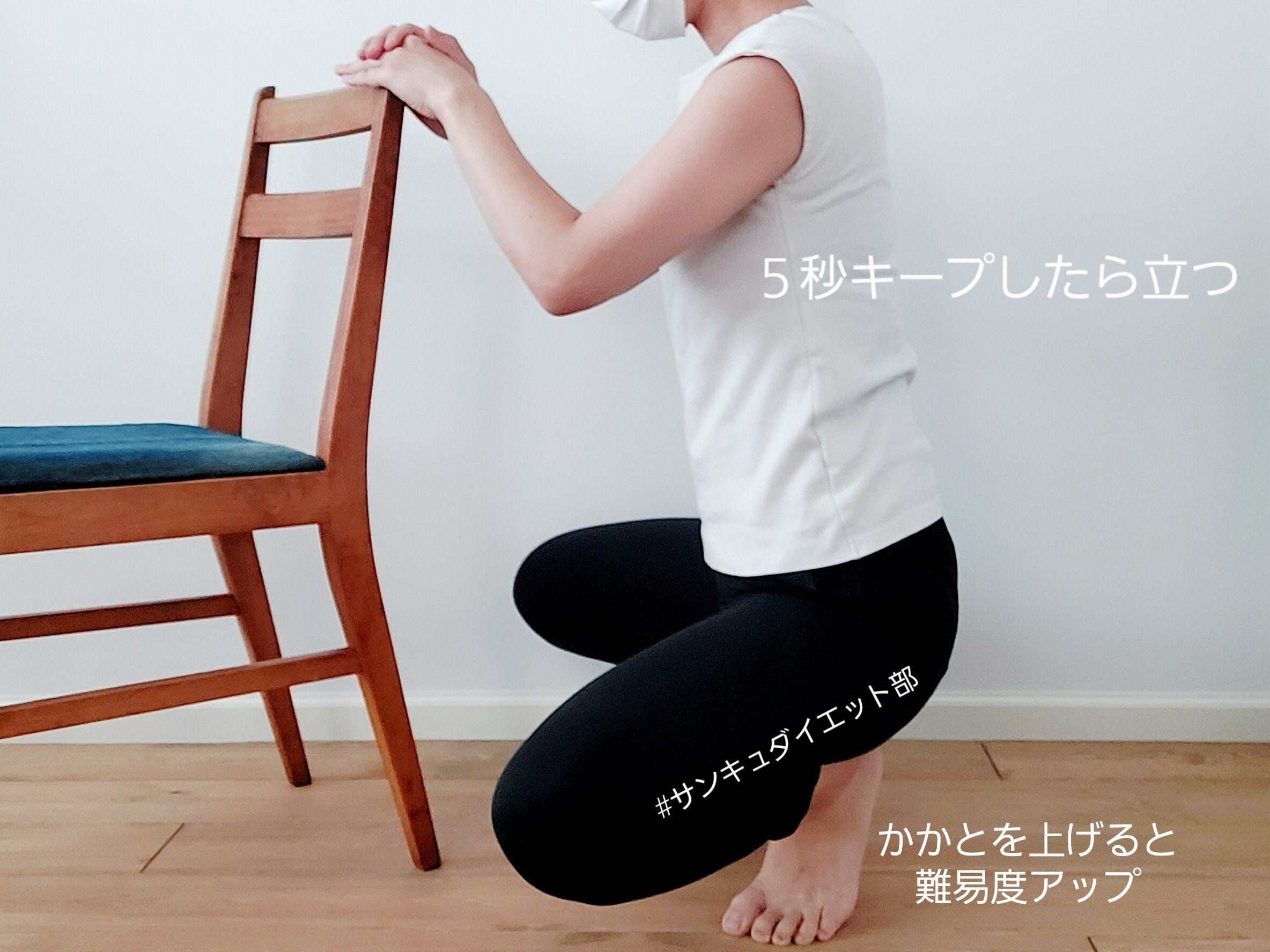 しゃがんだ姿勢を5秒キープしたら立ち上がる。を3回繰り返すだけなのでお試しください。