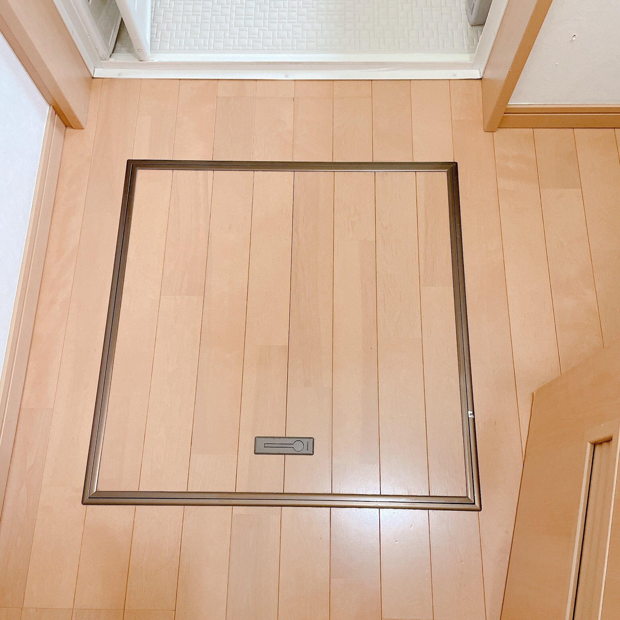 たまたま今はありませんでしたが、シャンプーなどもストックがあればここに。バスルームの目の前が床下収納なので、ここにあればすぐに補充できます。