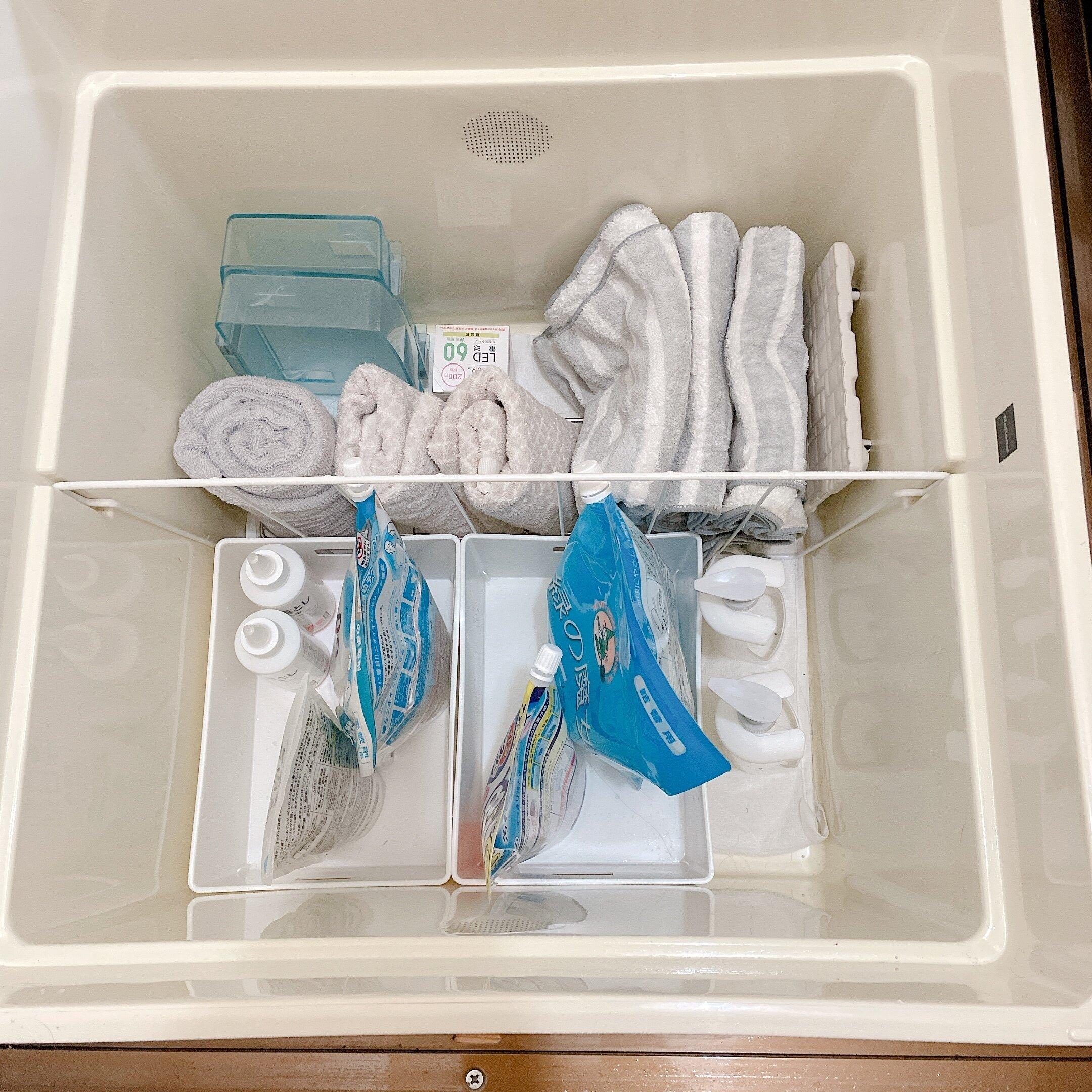 ちょうどいい大きさのケースなどを使って仕切っておけば、中でぐちゃぐちゃになってしまうことを防げます。大きなスペースだからこそ、きちんと仕切って、上から見た時にすべてが見えるようにしておくことが大事!プラスチック製のケースなので、汚れたらまるごと水洗いできるのも便利です。