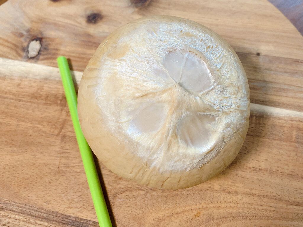 パッケージを開けるとストローが出てきました。ココナッツの下の部分に3つへこみがあるので1番上の部分にストローを刺します!それまではキンキンに冷やすことは必須です!