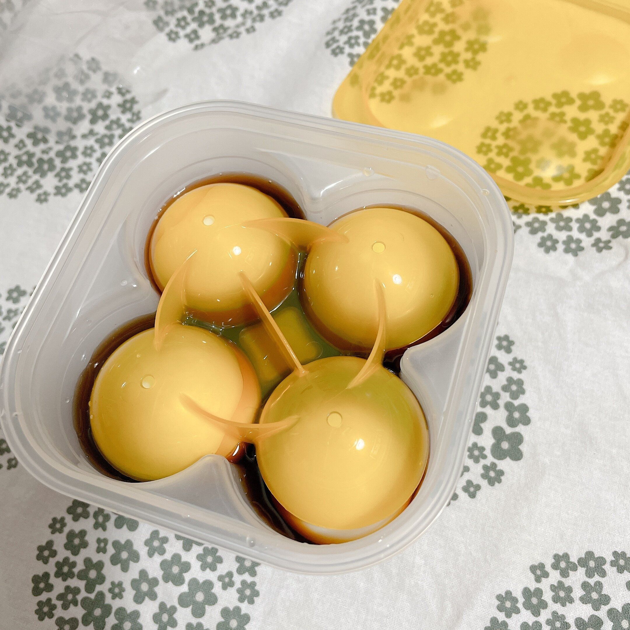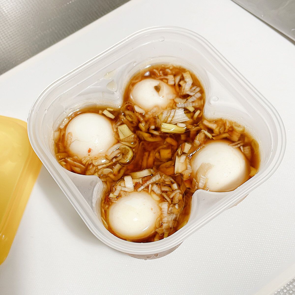 ゆで卵を作ったら、殻をむいて容器に入れて、容器についている線までめんつゆを注いだだけ。
