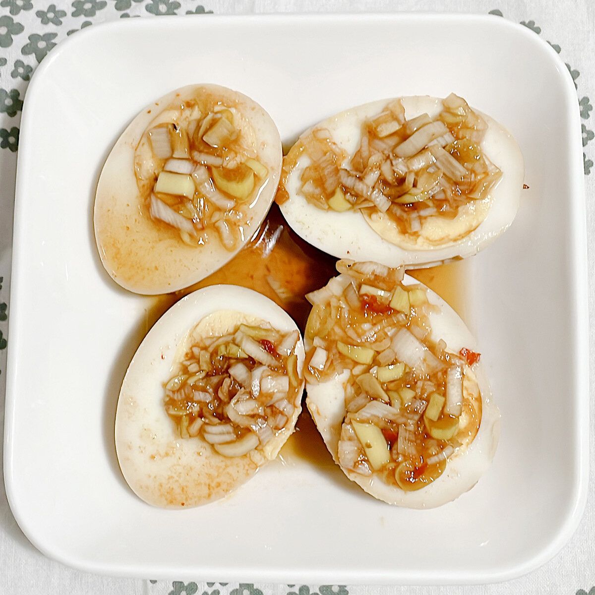 ピリ辛のたれを、カットしたたまごにかけて完成。