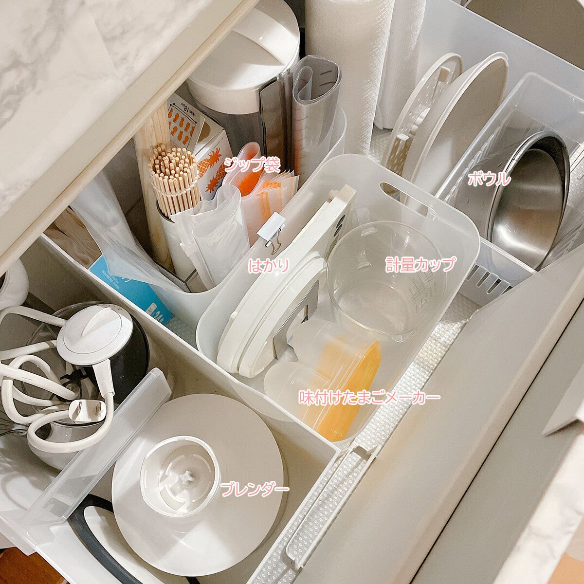 シンク下の計量カップの横がちょうどあいていたので、そこにしまうことにしました。