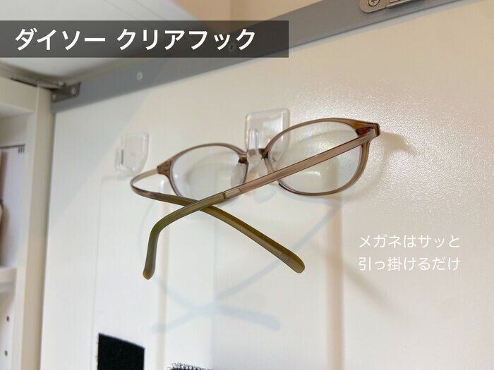 こちらはダイソーのクリアフックを使って眼鏡をかけて収納しています。