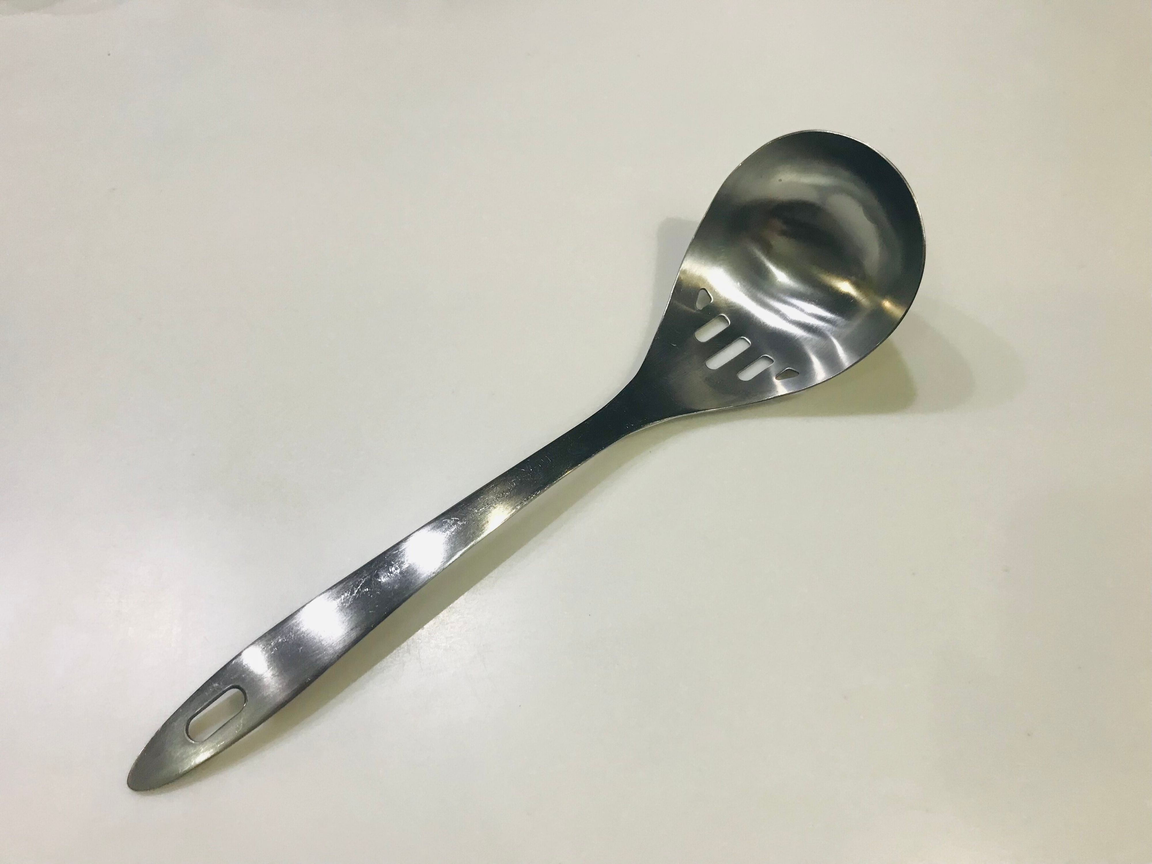 これ1本でおたまと穴あきおたまが兼用できちゃうんです。この水切りレードルを購入してから穴あきおたまは処分しましたが、特に問題なく暮らせています。