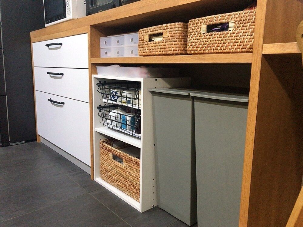 我が家のキッチンは広めですが、食器棚は腰の高さから下の引き出し3段分とカラーボックス2段分と収納が少なめです。少ない収納でも管理しやすく、取り出しやすくするためになるべく「専用のモノ」を持たないように心がけています。
