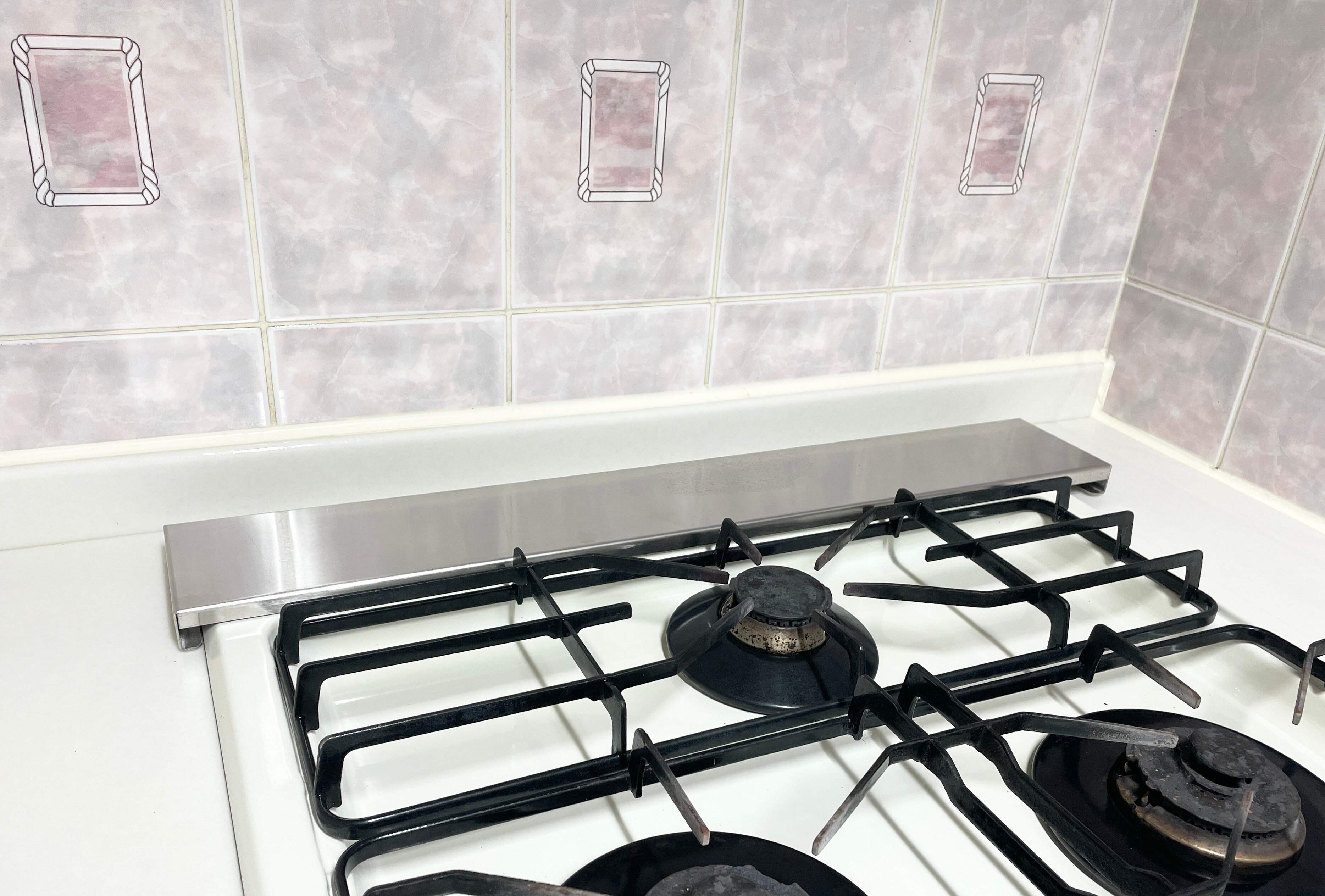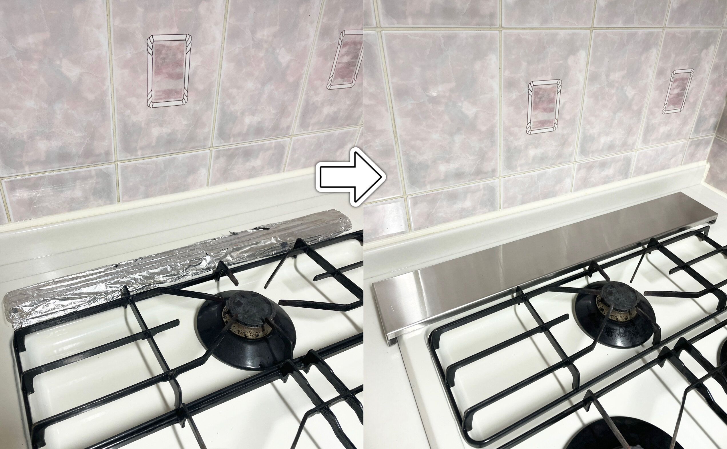 アルミホイルを巻いていた排気口に、この「排気口カバー」を置くだけでスッキリとした雰囲気に!薄いから圧迫感もまったくなく、逆にコンロまわりが広く見えますよね。