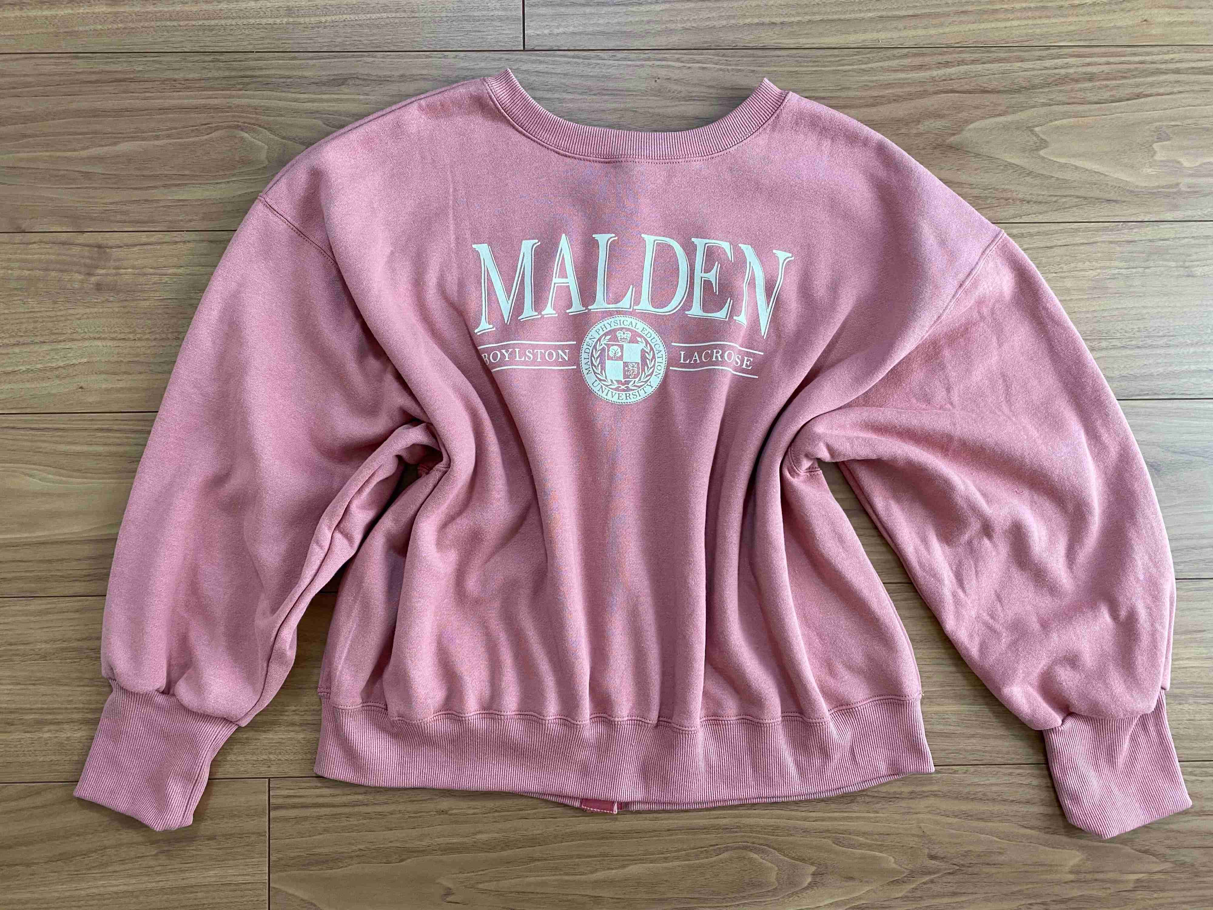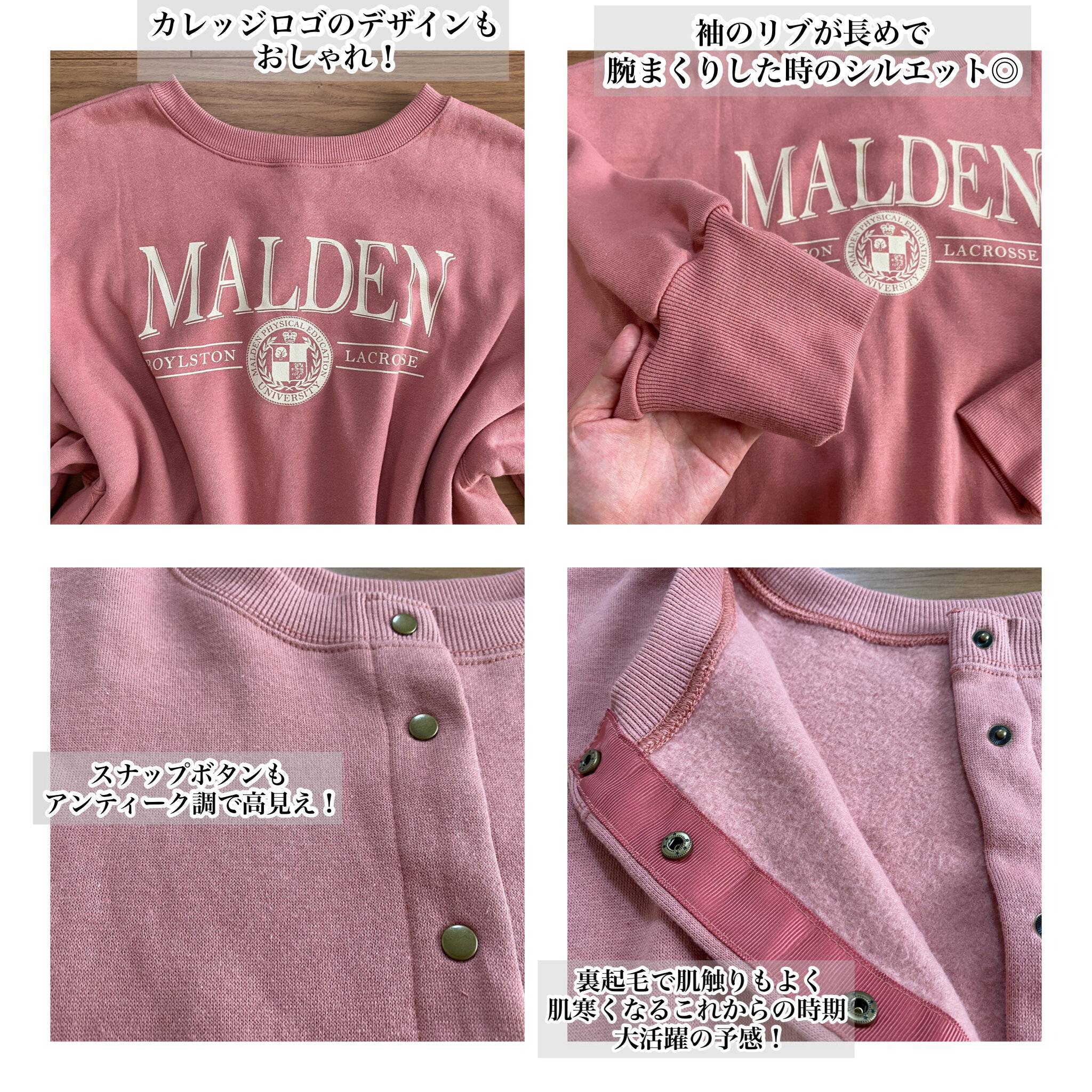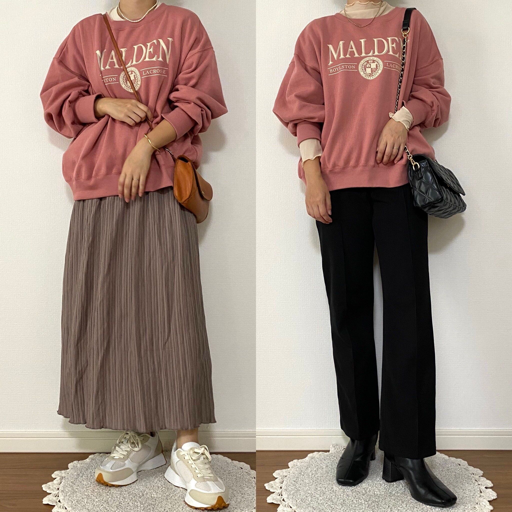 胸にカレッジロゴがプリントされた大人でも着こなしやすい絶妙なピンクのスウェット…と思いきや。