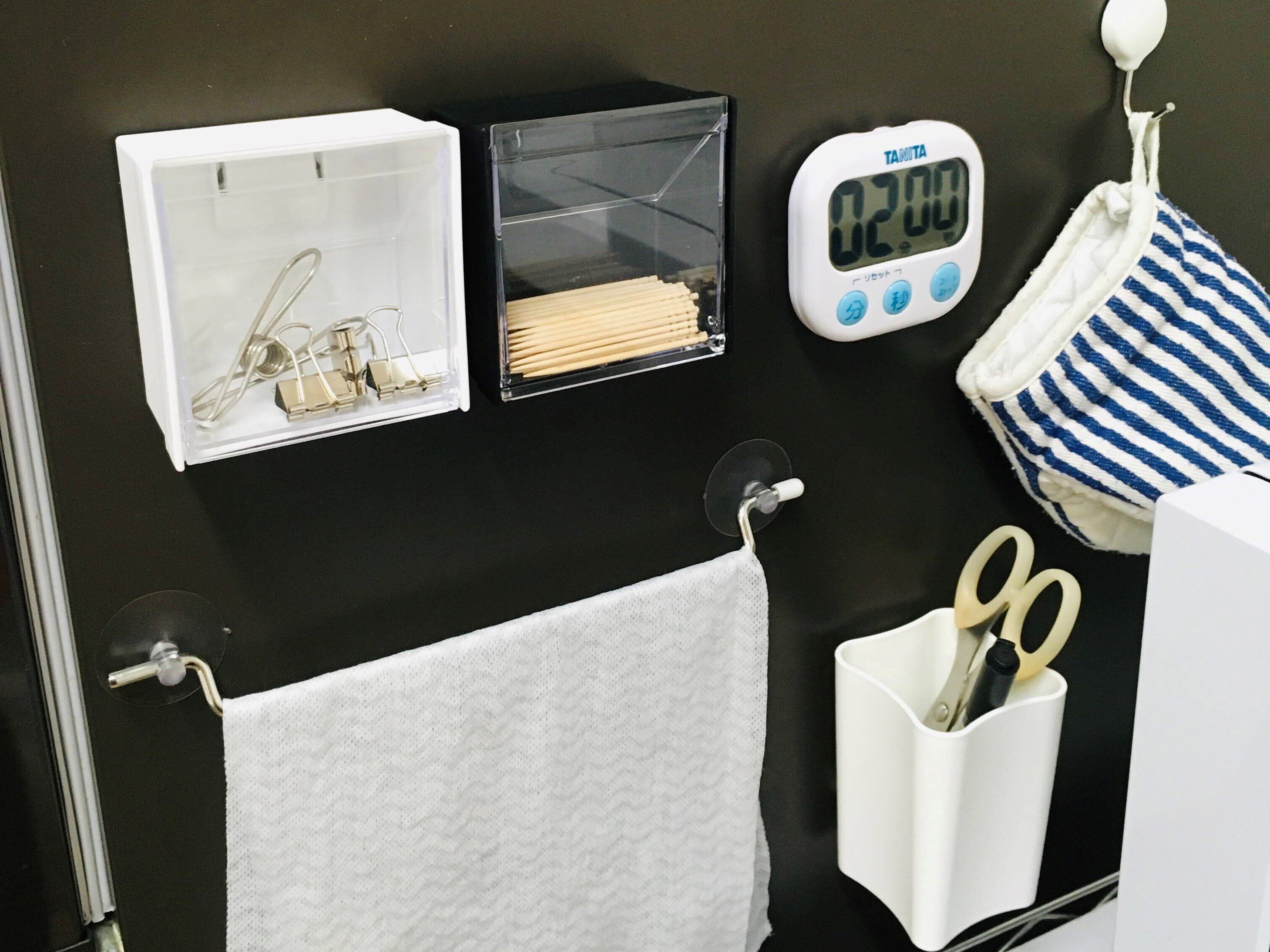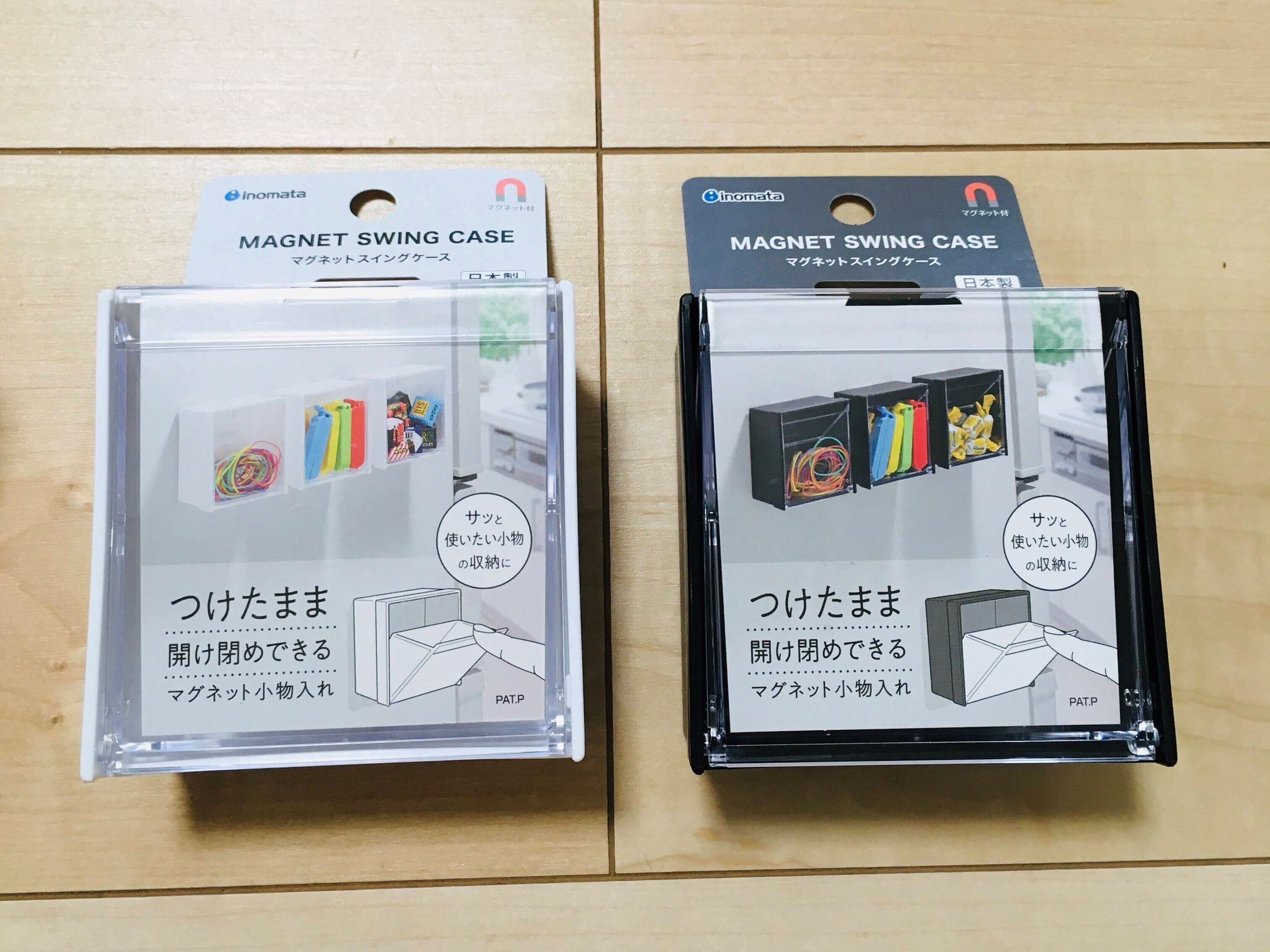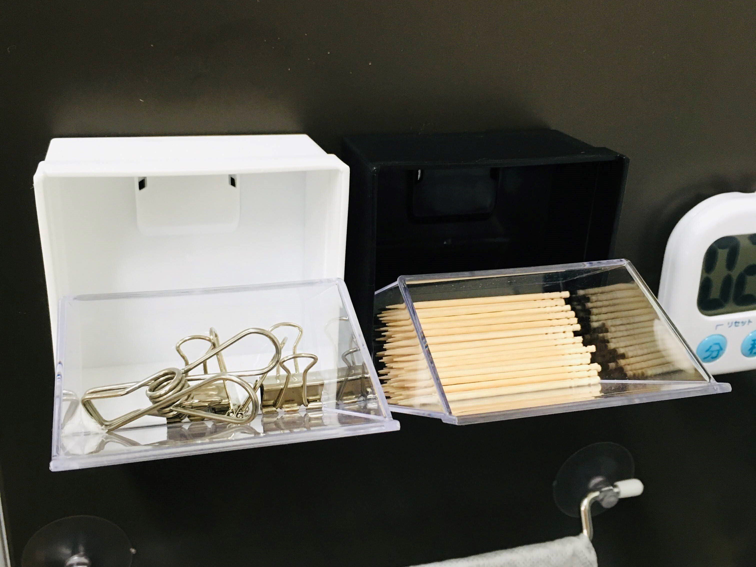 つけたまま開け閉めできるマグネット小物入れです。ホワイトとブラックの二色がありどちらにも決めきれず両方購入しました。クリアタイプで中身が一目で分かるのでラベリングをする必要もありません。