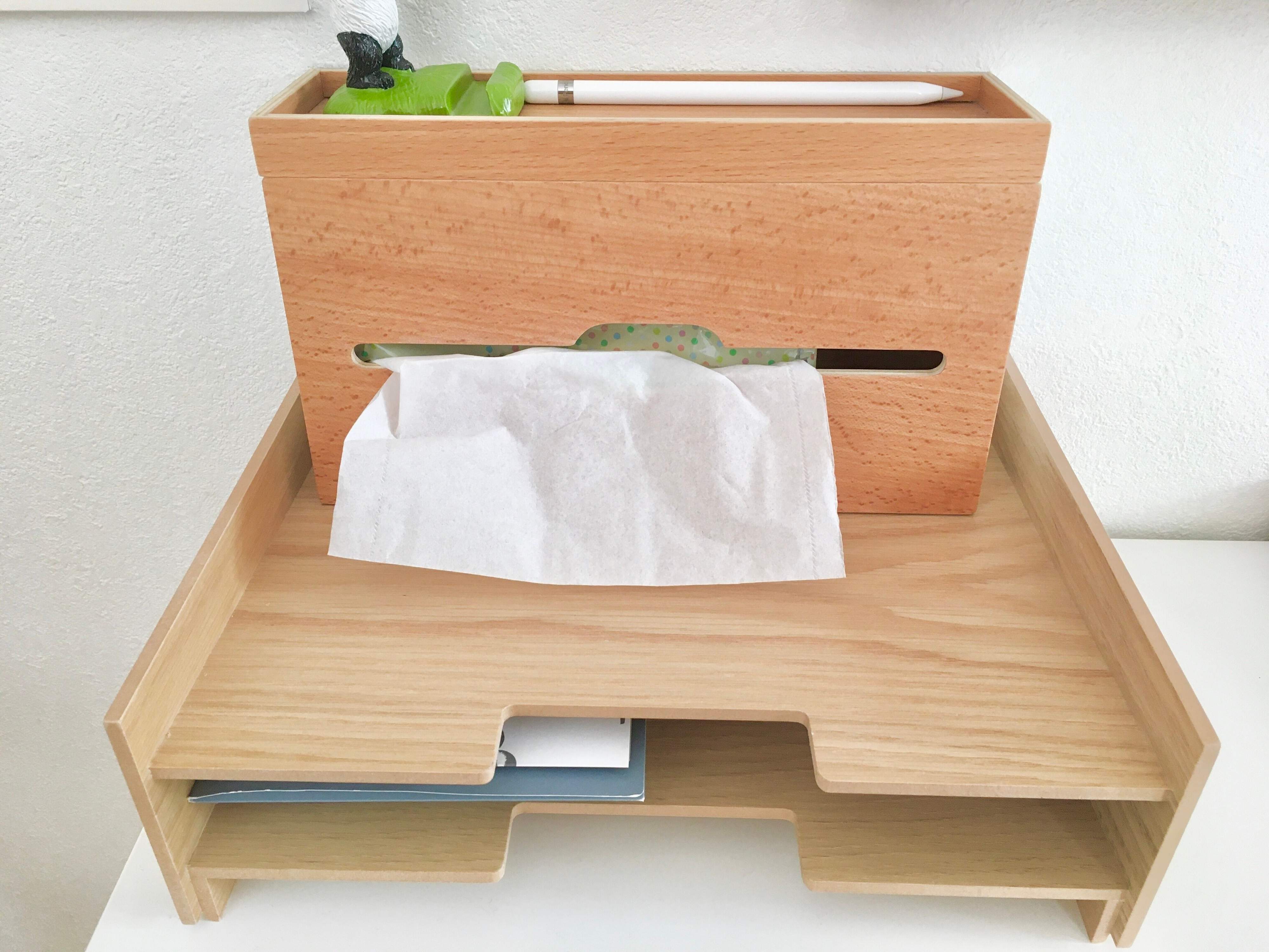 このトレーは無印良品の「木製書類整理トレー」(2,490円/商品番号82603347)です。リビングにあっても馴染む色合いで気に入っています。(※画像のティッシュケースは別物です)