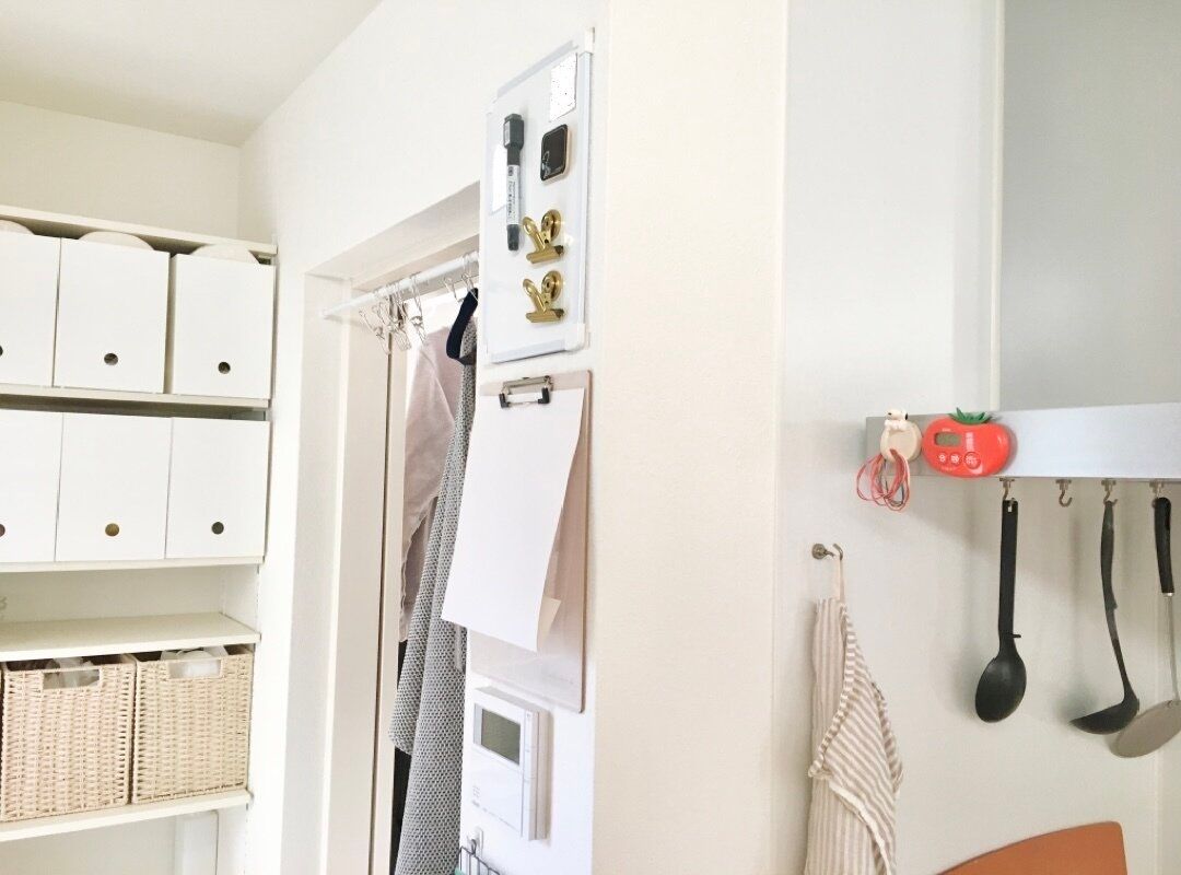 習い事の月間予定表など、月に何度も確認する書類はキッチン横の「掲示コーナー」に貼っています。我が家の冷蔵庫は前面がマグネット対応になっていないこともあり、100均のホワイトボードやバインダーなどを使ってこのコーナーを作りました。