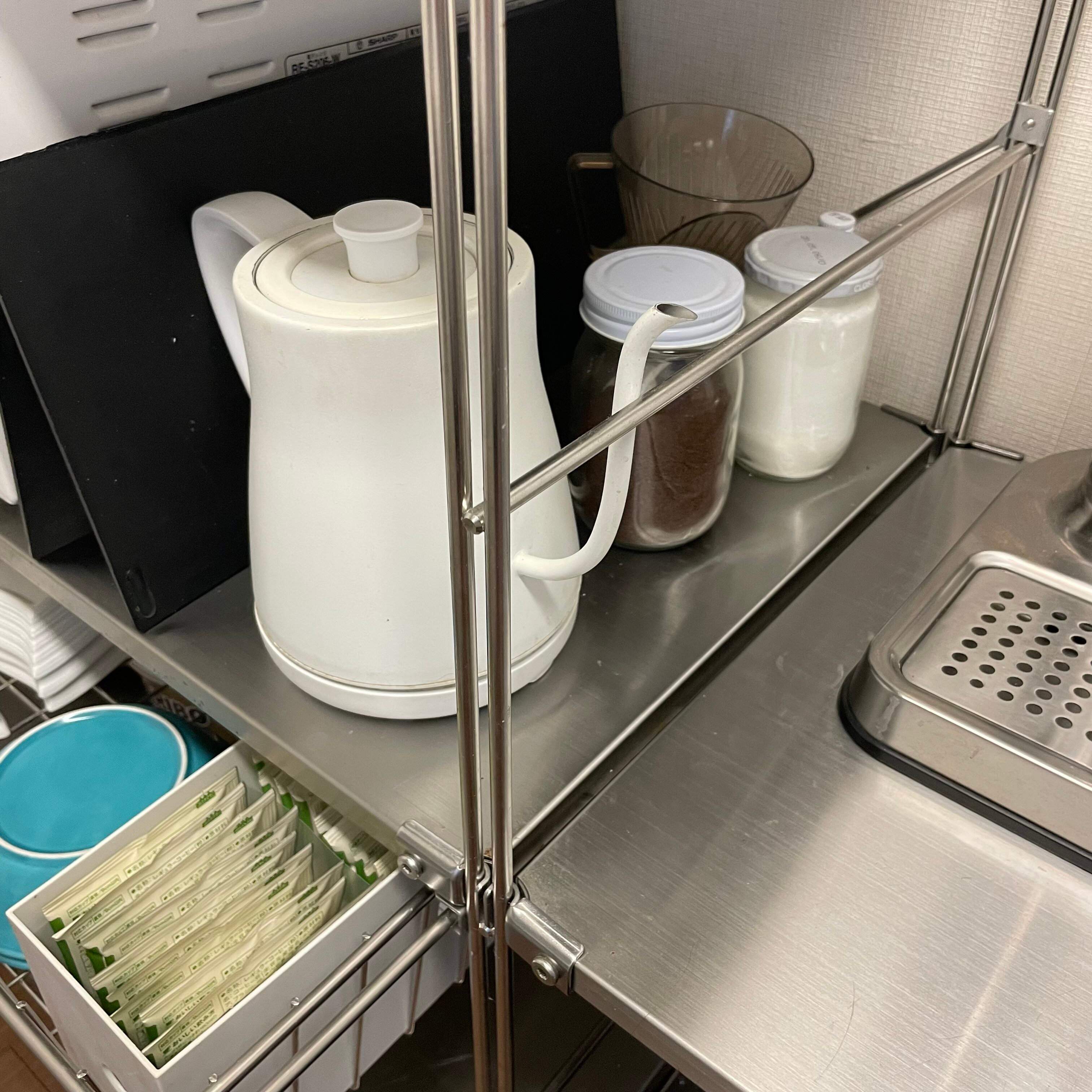 ケトルの奥にはコーヒーを淹れるセット一式、手前の引き出しにはドリップコーヒーをまとめています。