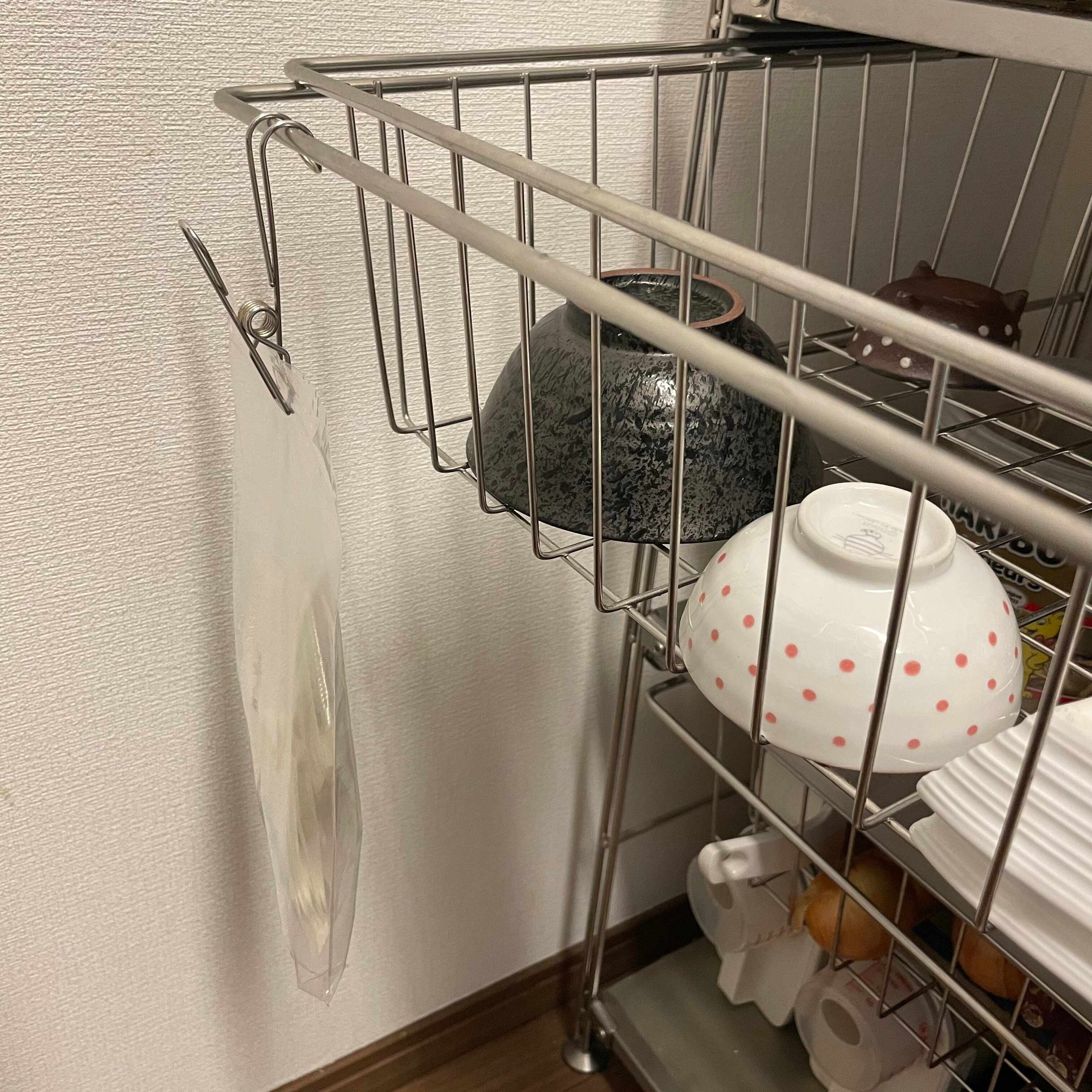 ステンレスユニットシェルフはひっかけられる部分も多い点がポイントです。