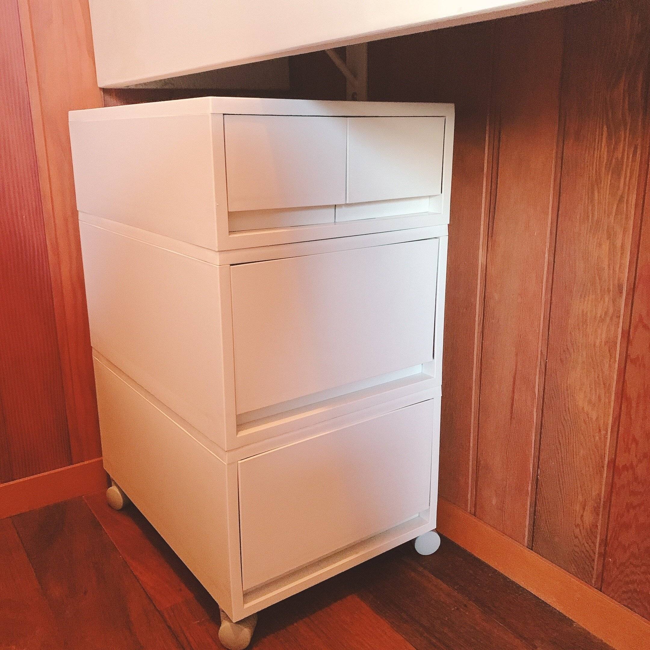 生理用品や掃除グッズ、トイレットペーバーは無印良品のポリプロピレンケース引出式・浅型ホワイトグレーにキャスターをつけて使用。キャスターがあると、掃除の際も楽に移動ができて、清潔を維持できます。