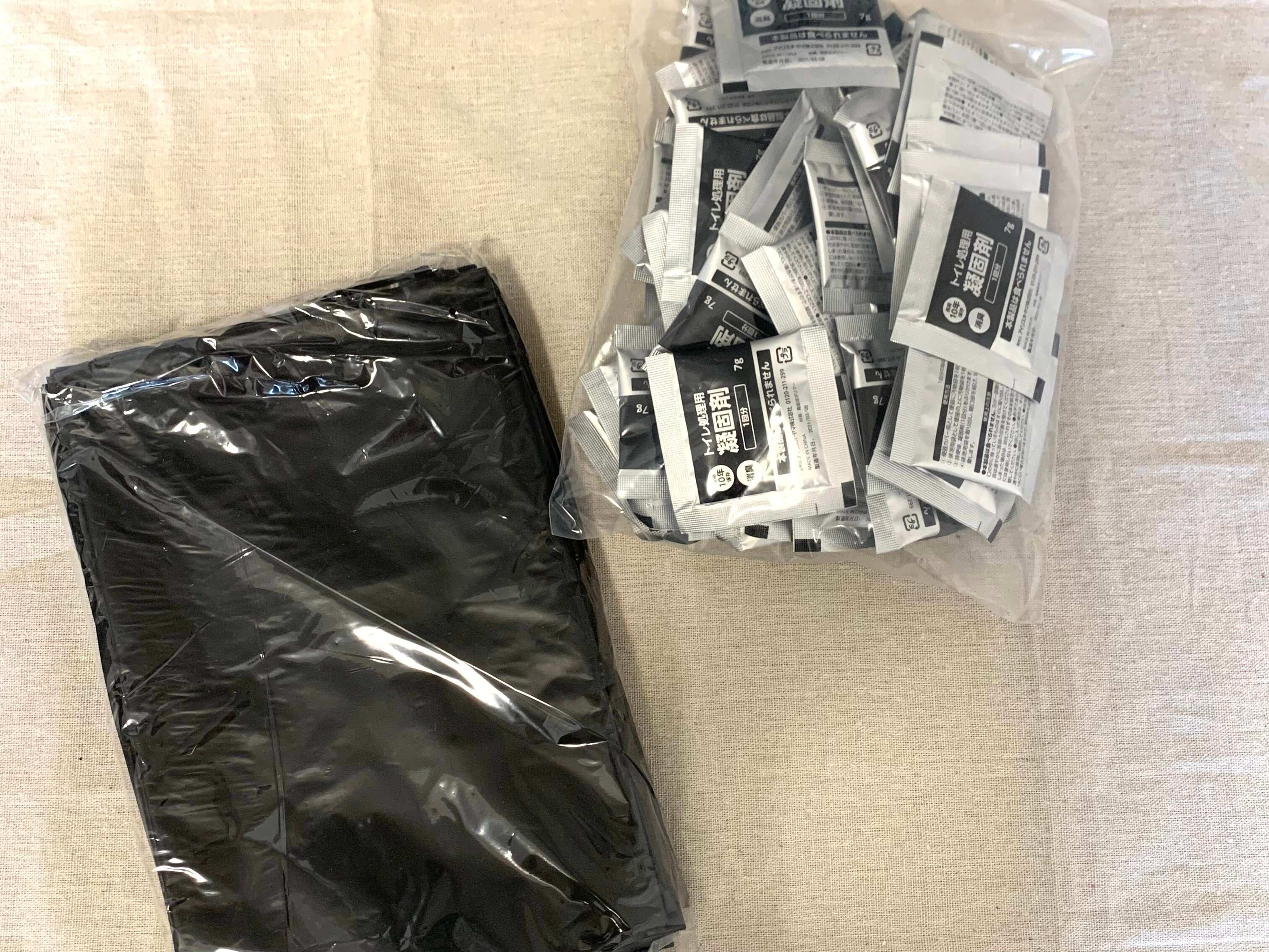 汚物袋は大判でしっかりしていますが、薄手なので折り畳めばかさばりません。凝固剤もコンパクトなので、何セットか避難用の防災バッグにも入れています。