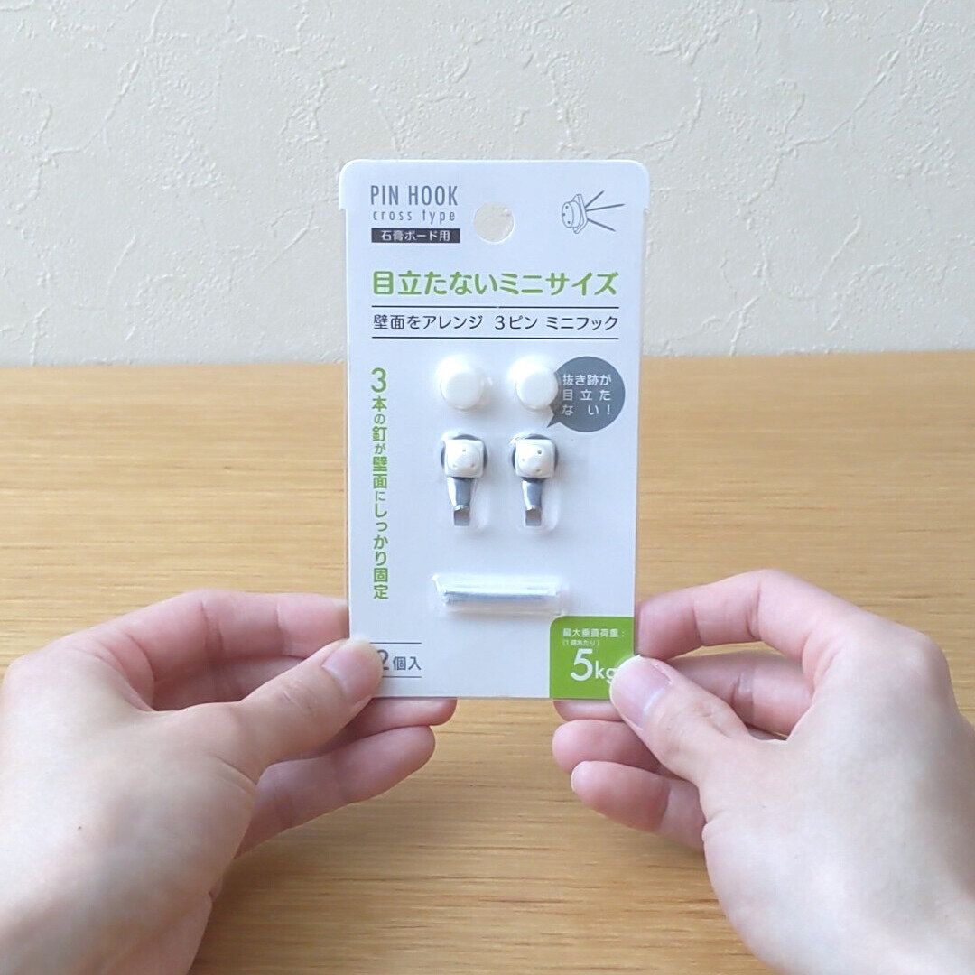 100均で購入できる3ピンフックを活用すれば、簡単に壁に設置できます!
