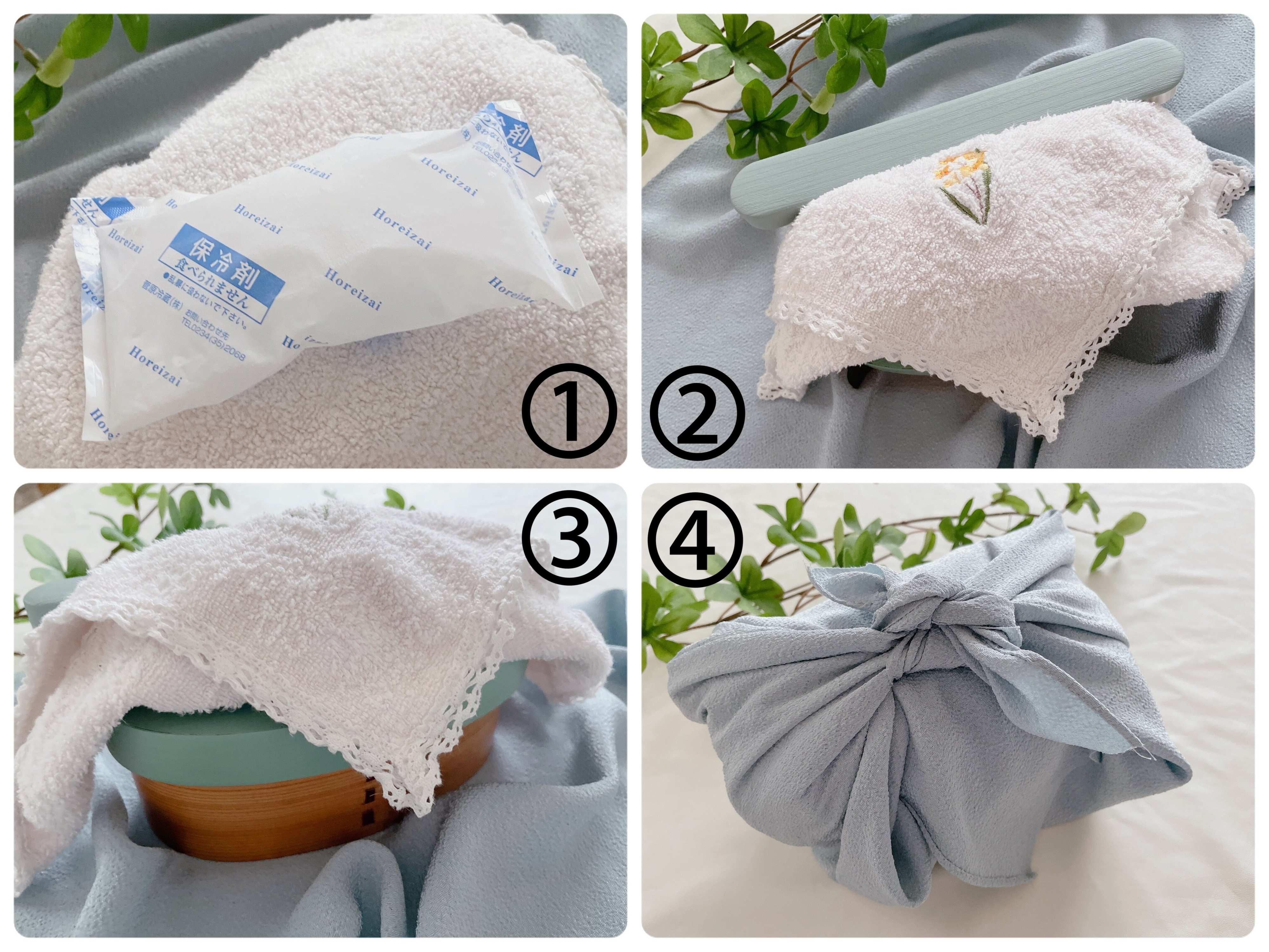 ちょうどお弁当を食べる頃に保冷剤は溶けていますが、タオルハンカチで包むことでお弁当箱が濡れてしまうのを防ぐことができます。
