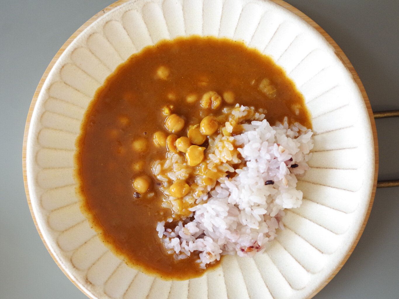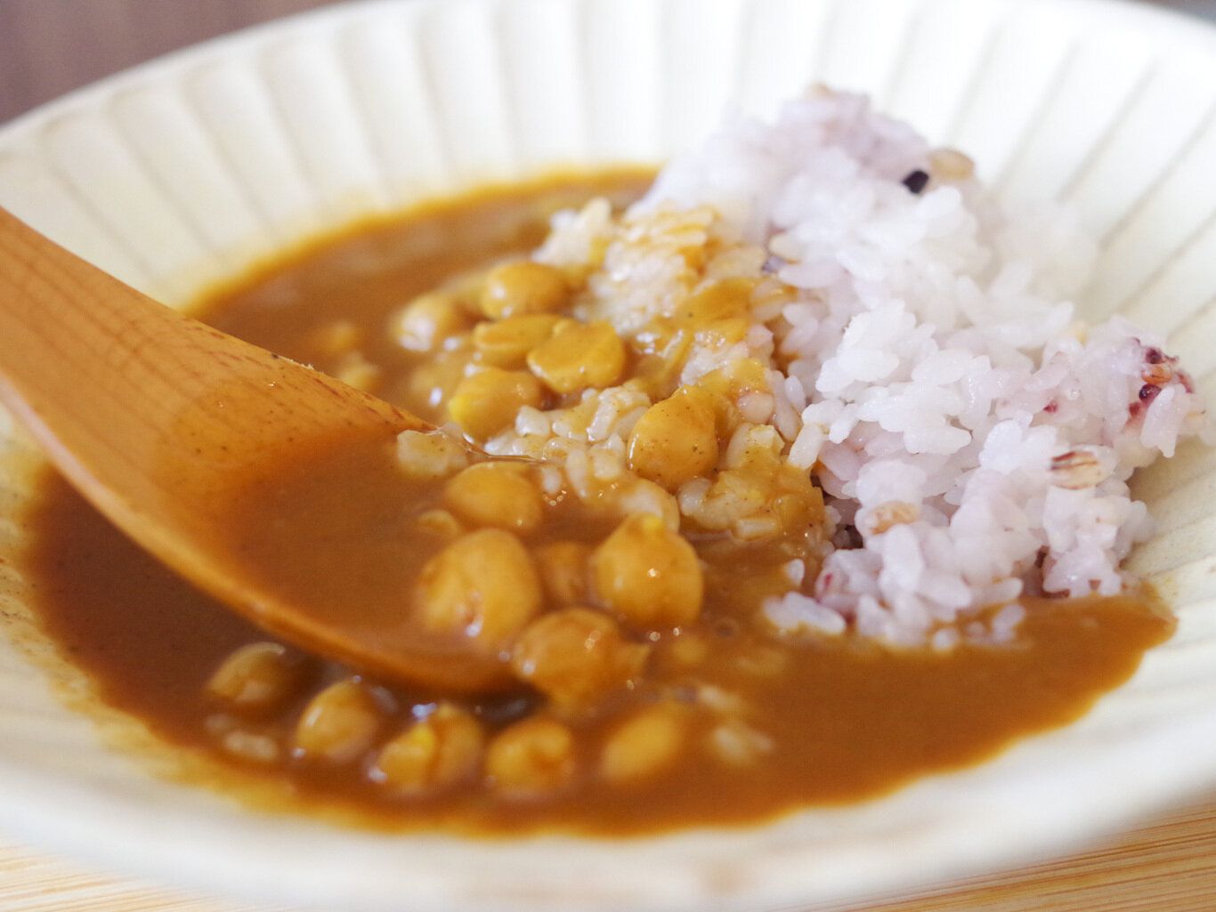 ひよこ豆がたっぷり入った、満足感のある中辛カレーです。 動物性原材料を使わないヴィーガンなカレーという点にも注目したいですね。