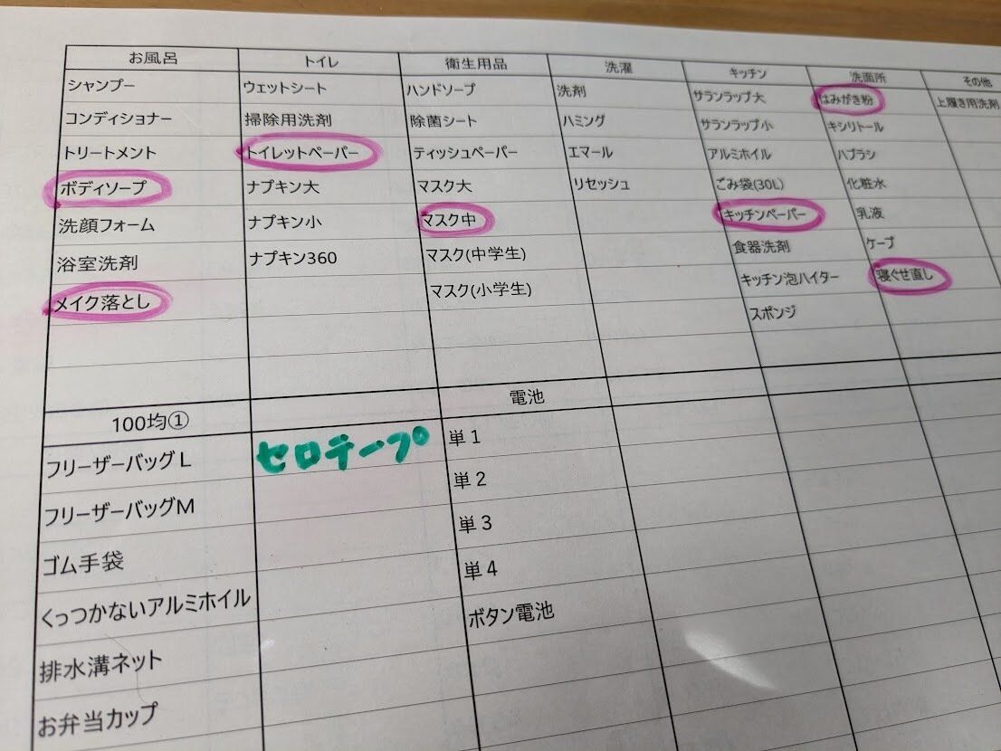 買い忘れを防ぐために、作った我が家の買い物リストを紹介しています。丸を付けるだけの簡単リスト。家族みんな誰でお書くことが出来るので、在庫管理を一人でする負担から解消された「オリジナル買い物リスト」です。